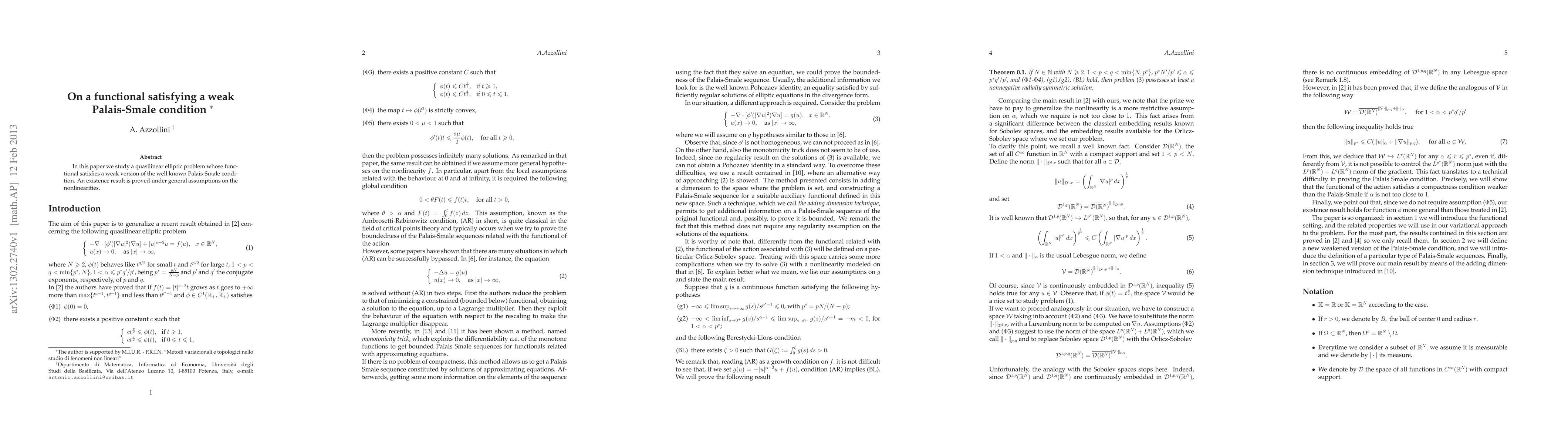 This paper investigates a quasilinear elliptic problem where the associated functional meets a weak Palais-Smale condition, proving existence of solutions under general conditions on the nonlinear terms.