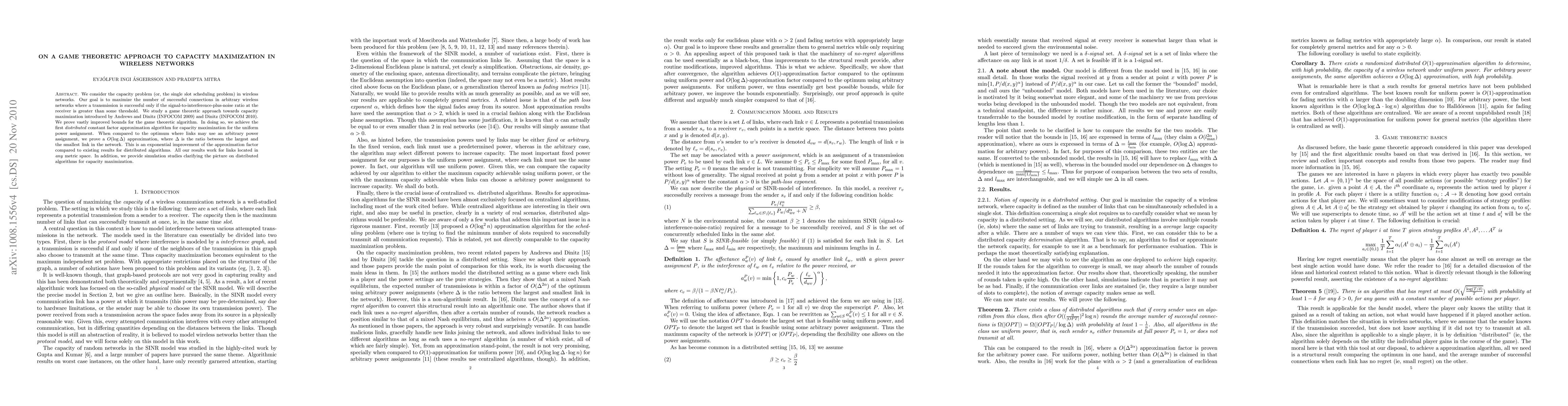This paper proposes a game theoretic approach to maximize the capacity in wireless networks by scheduling successful connections. It presents improved bounds for the algorithm, achieving the first distributed constant factor approximation for uniform power assignment, with an approximation factor of $O(\log \Delta)$.