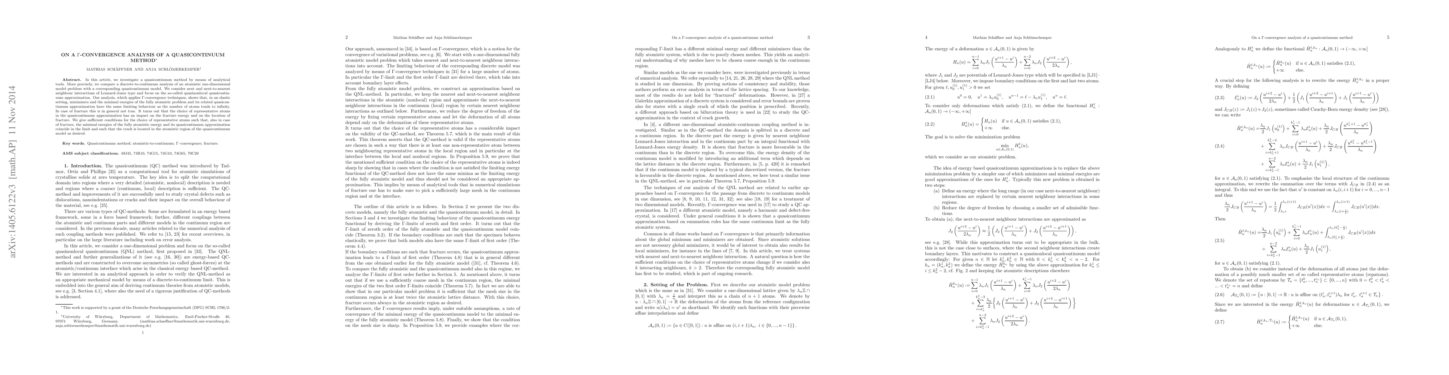This research analyzes a quasicontinuum method using $Gamma$-convergence techniques, comparing atomistic and quasicontinuum models in 1D Lennard-Jones systems. It shows similar elastic behavior limits, but fracture cases differ based on representative atom selection. Conditions are provided for atom selection ensuring consistent energy limits and crack location in atomistic regions.