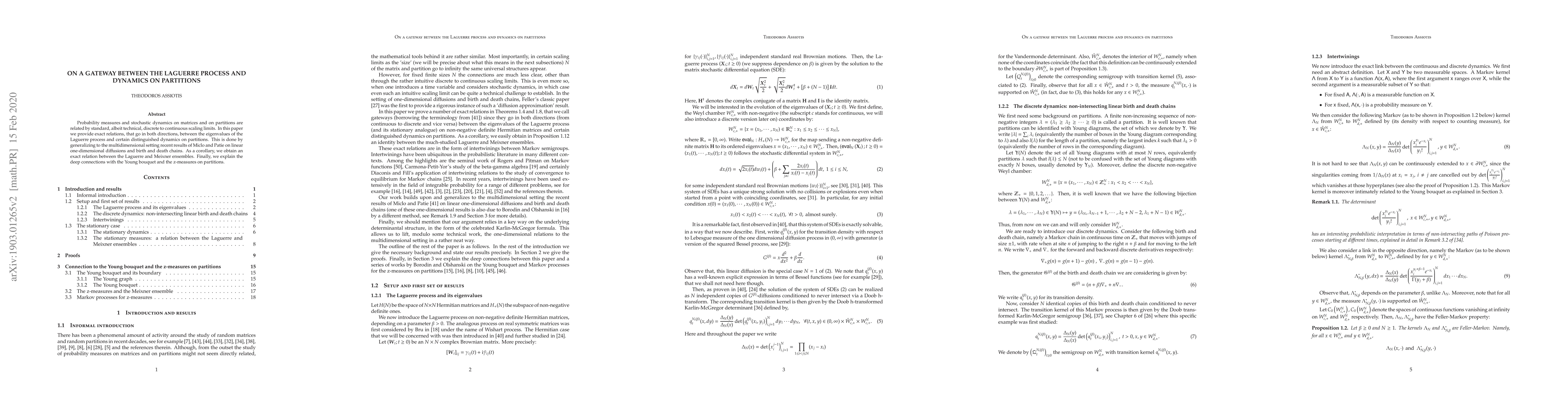 Probability measures and stochastic dynamics on matrices and on partitions are related by standard, albeit technical, discrete to continuous scaling limits. In this paper we provide exact relations, that go in both directions, between the eigenvalues of the Laguerre process and certain distinguished dynamics on partitions. This is done by generalizing to the multidimensional setting recent results of Miclo and Patie on linear one-dimensional diffusions and birth and death chains. As a corollary, we obtain an exact relation between the Laguerre and Meixner ensembles. Finally, we explain the deep connections with the Young bouquet and the z-measures on partitions.