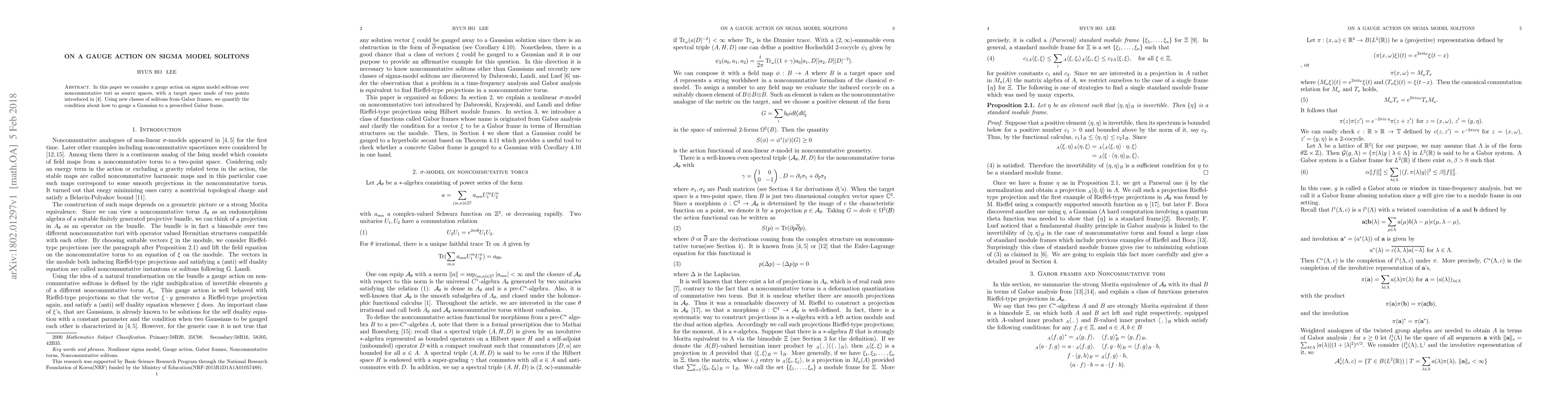 In this paper we consider a gauge action on sigma model solitons over noncommutative tori as source spaces, with a target space made of two points introduced in \cite{DKL:Sigma}. Using new classes of solitons from Gabor frames, we quantify the condition about how to gauge a Gaussian to a prescribed Gabor frame.
