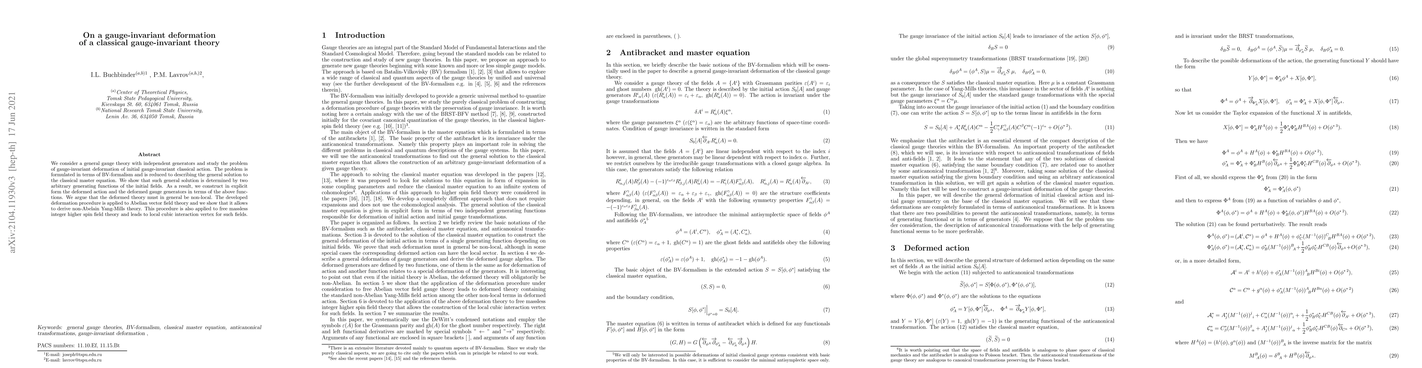 This paper investigates gauge-invariant deformations of classical gauge theories using BV-formalism, showing that the deformed action and gauge generators depend on two arbitrary functions. The method is exemplified in Abelian vector field theory to derive non-Abelian Yang-Mills theory and in higher spin field theory to obtain a local cubic interaction vertex.
