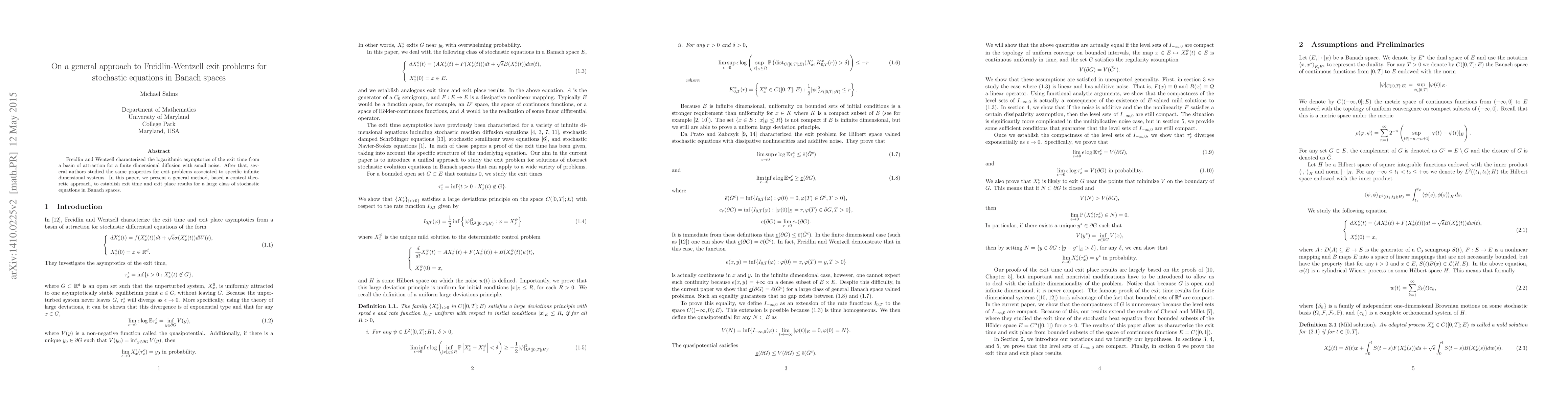 This paper introduces a control theoretic method to determine the exit time and place for a broad class of stochastic equations in Banach spaces, extending the Freidlin-Wentzell theory from finite to infinite dimensions. The approach is general and applicable to various infinite-dimensional systems.