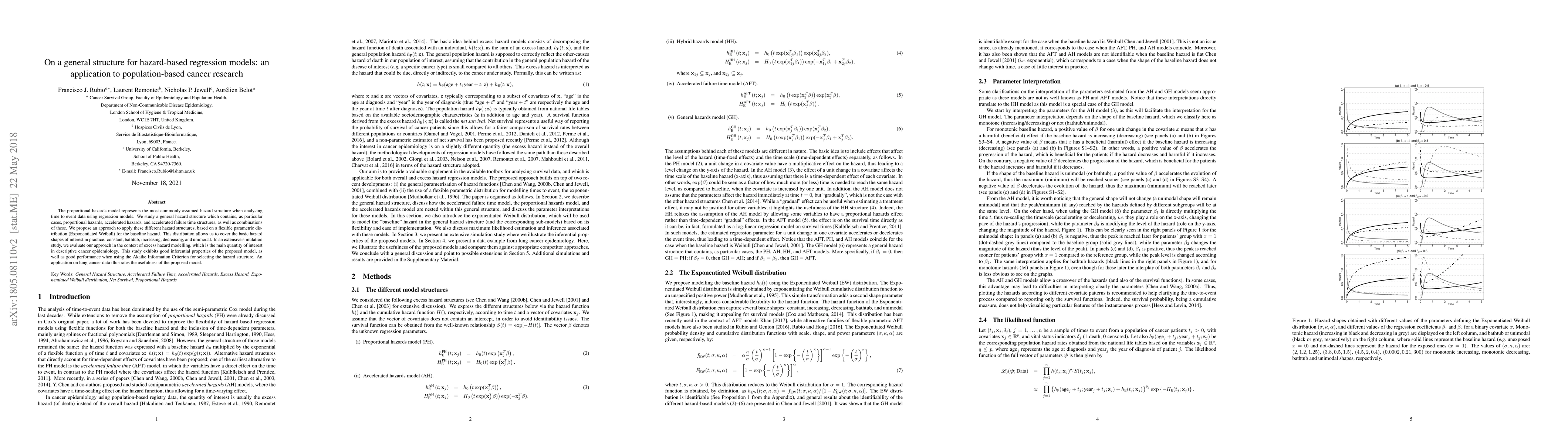 The proportional hazards model represents the most commonly assumed hazard structure when analysing time to event data using regression models. We study a general hazard structure which contains, as particular cases, proportional hazards, accelerated hazards, and accelerated failure time structures, as well as combinations of these. We propose an approach to apply these different hazard structures, based on a flexible parametric distribution (Exponentiated Weibull) for the baseline hazard. This distribution allows us to cover the basic hazard shapes of interest in practice: constant, bathtub, increasing, decreasing, and unimodal. In an extensive simulation study, we evaluate our approach in the context of excess hazard modelling, which is the main quantity of interest in descriptive cancer epidemiology. This study exhibits good inferential properties of the proposed model, as well as good performance when using the Akaike Information Criterion for selecting the hazard structure. An application on lung cancer data illustrates the usefulness of the proposed model.