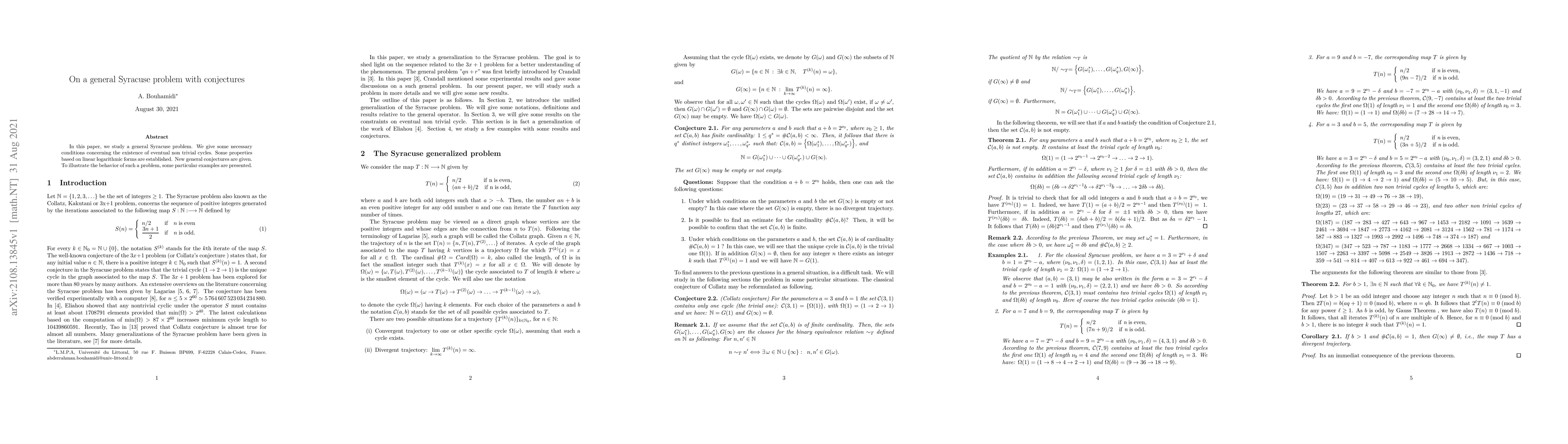 In this paper, we study a general Syracuse problem. We give some necessary conditions concerning the existence of eventual non trivial cycles. Some properties based on linear logarithmic forms are established. New general conjectures are given. To illustrate the behavior of such a problem, some particular examples are presented.
