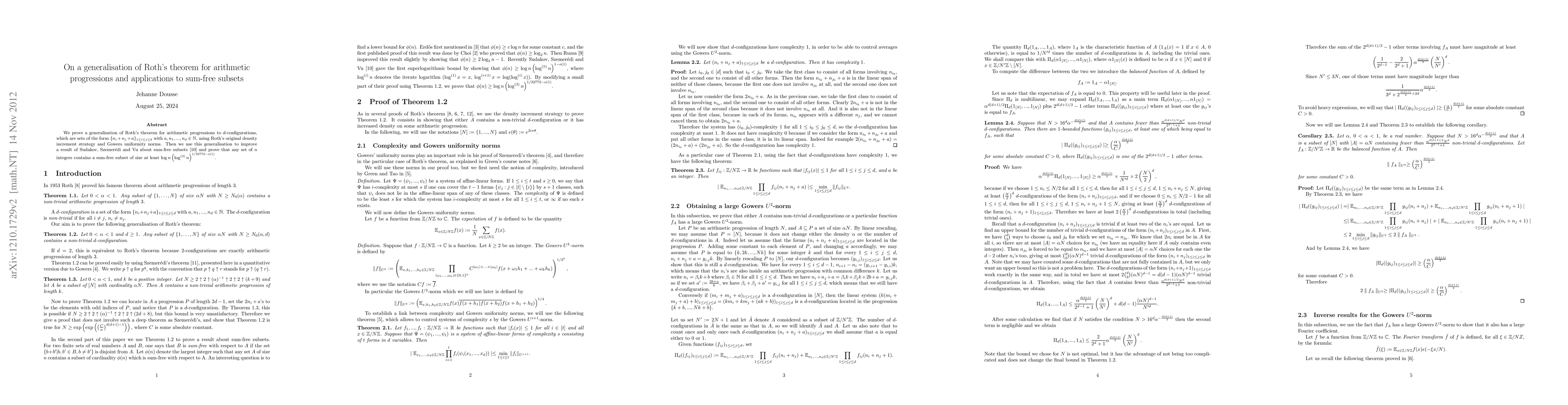 This paper generalises Roth's theorem for arithmetic progressions to d-configurations using density increment strategy and Gowers norms, and applies this to enhance results on sum-free subsets, proving that any set of n integers contains a sum-free subset of size at least log n (log log log n)^{1/32772 - o(1)}.