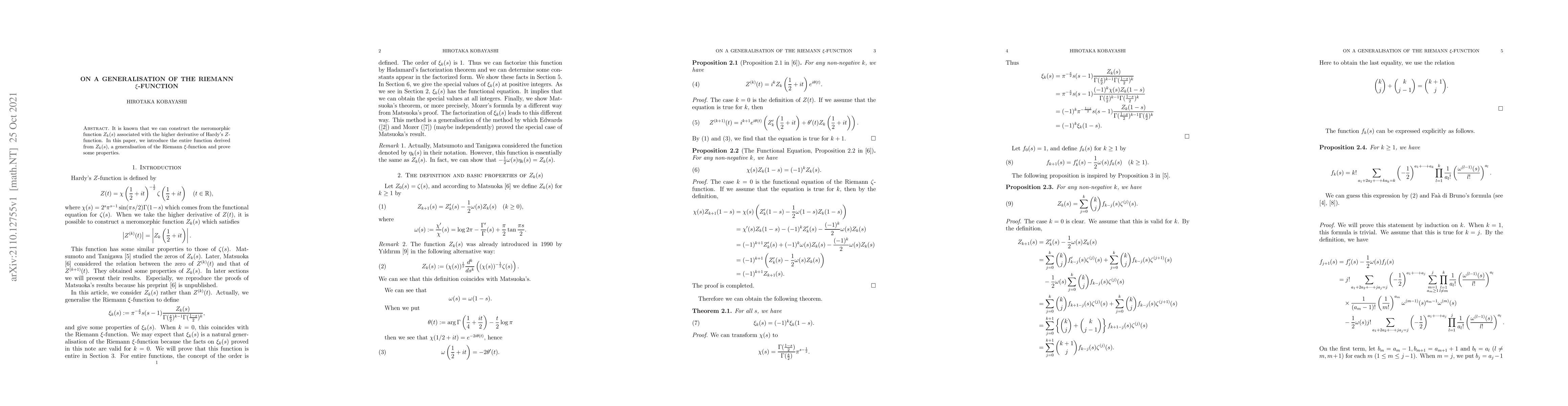 Summary: This paper introduces a generalisation of the Riemann $\xi$-function derived from the higher derivative of Hardy's $Z$-function, establishing its properties and demonstrating its entire function nature.