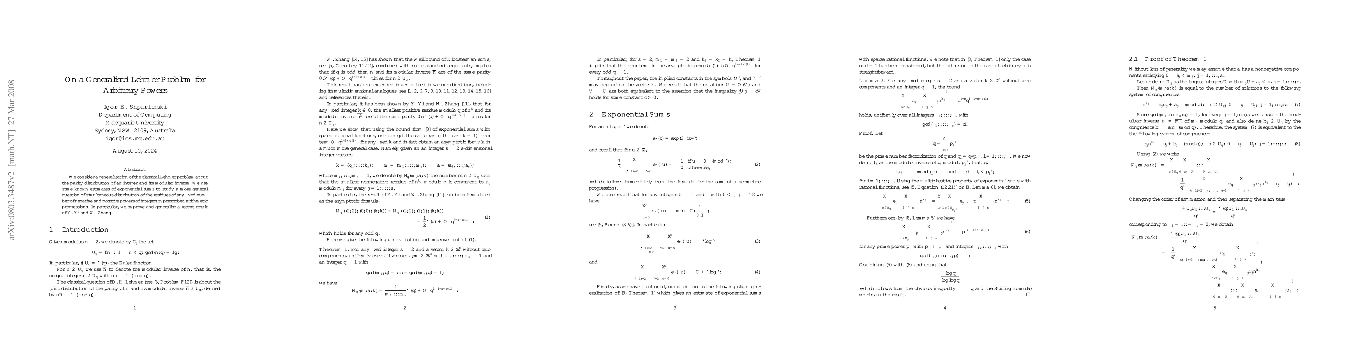 We consider a generalisation of the classical Lehmer problem about the parity distribution of an integer and its modular inverse. We use some known estimates of exponential sums to study a more general question of simultaneous distribution of the residues of any fixed number of negative and positive powers of integers in prescribed arithmetic progressions. In particular, we improve and generalise a recent result of Y. Yi and W. Zhang.