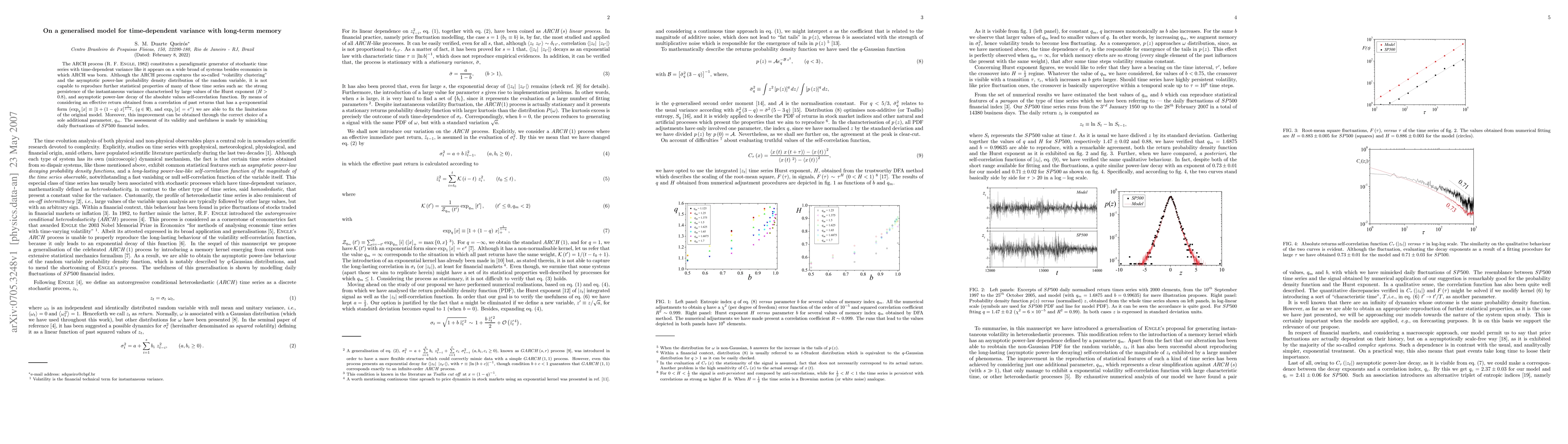 The ARCH process (R. F. Engle, 1982) constitutes a paradigmatic generator of stochastic time series with time-dependent variance like it appears on a wide broad of systems besides economics in which ARCH was born. Although the ARCH process captures the so-called "volatility clustering" and the asymptotic power-law probability density distribution of the random variable, it is not capable to reproduce further statistical properties of many of these time series such as: the strong persistence of the instantaneous variance characterised by large values of the Hurst exponent (H > 0.8), and asymptotic power-law decay of the absolute values self-correlation function. By means of considering an effective return obtained from a correlation of past returns that has a q-exponential form we are able to fix the limitations of the original model. Moreover, this improvement can be obtained through the correct choice of a sole additional parameter, $q_{m}$. The assessment of its validity and usefulness is made by mimicking daily fluctuations of SP500 financial index.