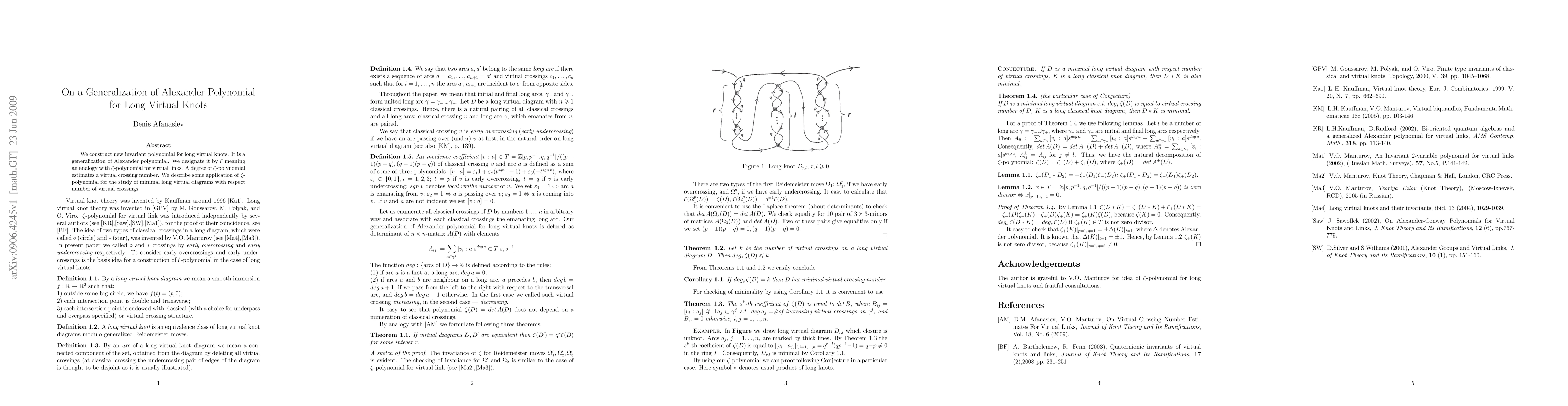 The paper introduces a new invariant polynomial, denoted as $\zeta$, which generalizes the Alexander polynomial for long virtual knots, estimating their virtual crossing number and aiding in the study of minimal diagrams. Applications focus on analyzing the number of virtual crossings in minimal long virtual diagrams.