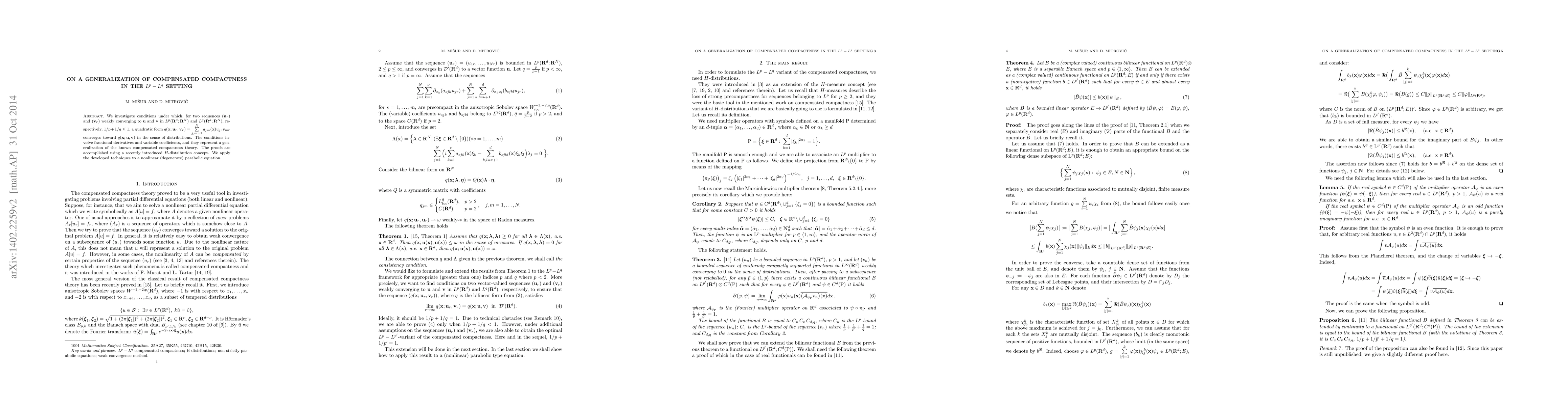 Researchers develop a generalization of compensated compactness theory for quadratic forms involving $L^p$ and $L^q$ spaces, using fractional derivatives and variable coefficients. The conditions involve new concepts from H-distribution theory.