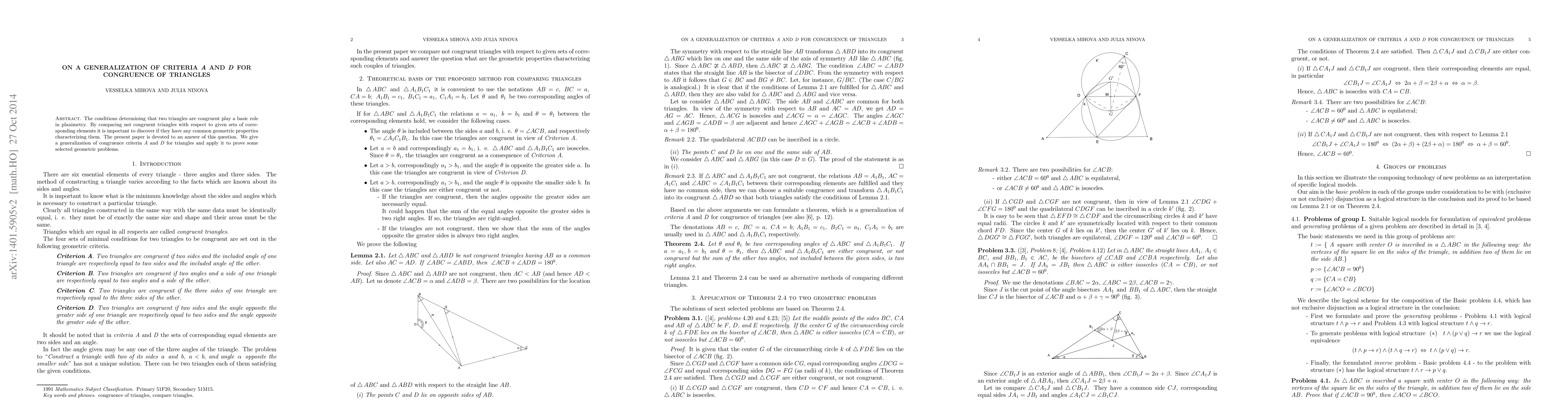 This paper presents a generalized version of criteria A and D for triangle congruence, aiming to identify shared geometric properties in non-congruent triangles. The research applies these generalized criteria to solve specific geometric problems.