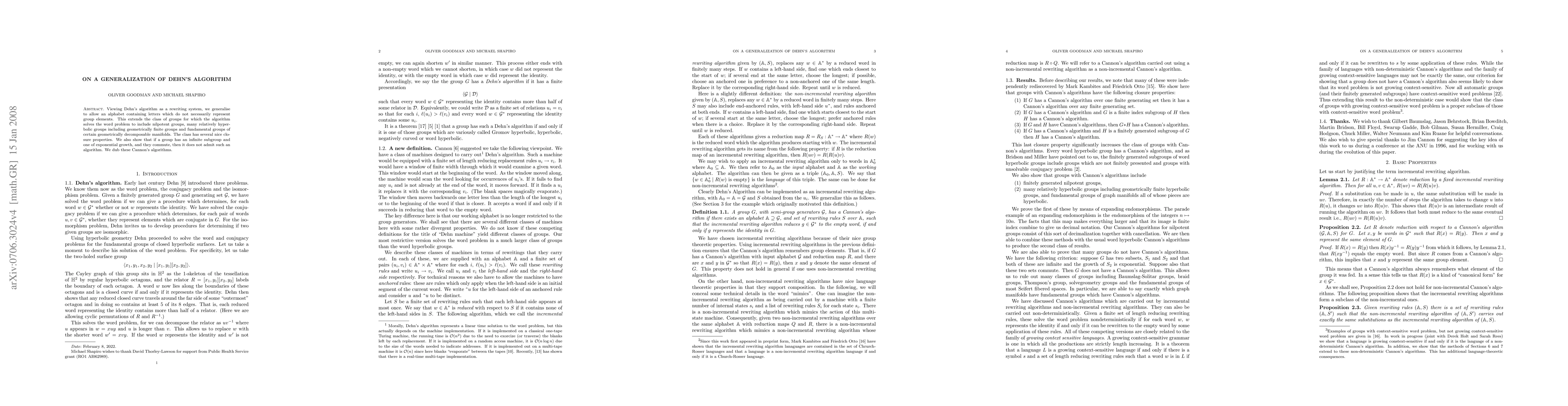 Viewing Dehn's algorithm as a rewriting system, we generalise to allow an alphabet containing letters which do not necessarily represent group elements. This extends the class of groups for which the algorithm solves the word problem to include nilpotent groups, many relatively hyperbolic groups including geometrically finite groups and fundamental groups of certain geometrically decomposable manifolds. The class has several nice closure properties. We also show that if a group has an infinite subgroup and one of exponential growth, and they commute, then it does not admit such an algorithm. We dub these Cannon's algorithms.
