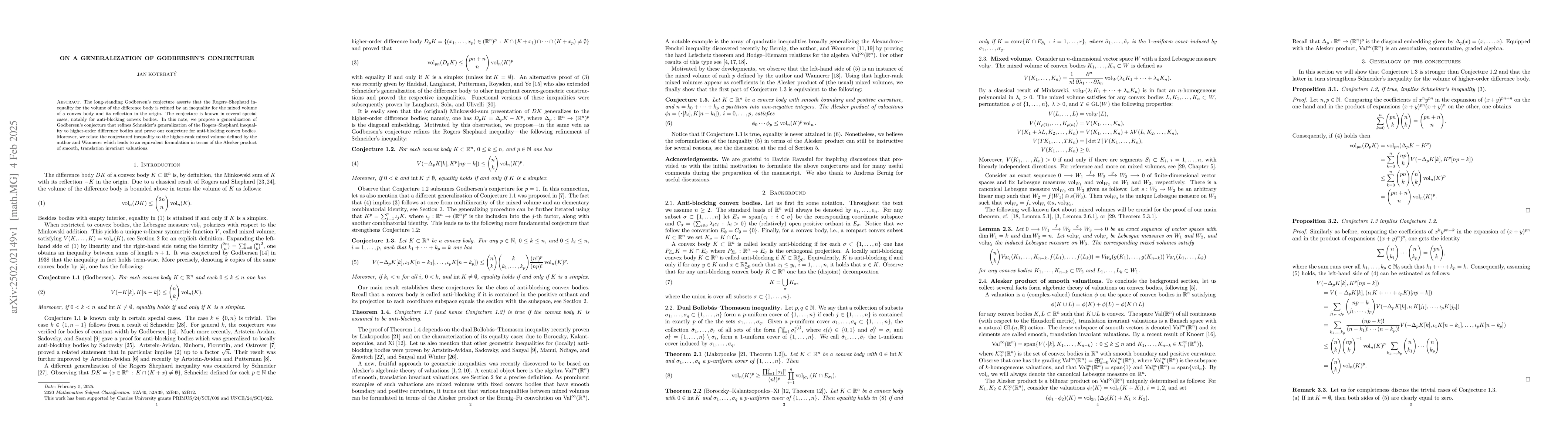 The paper proposes a generalization of Godbersen's conjecture, refining Schneider's version of the Rogers-Shephard inequality for higher-order difference bodies, and proves it for anti-blocking convex bodies.
