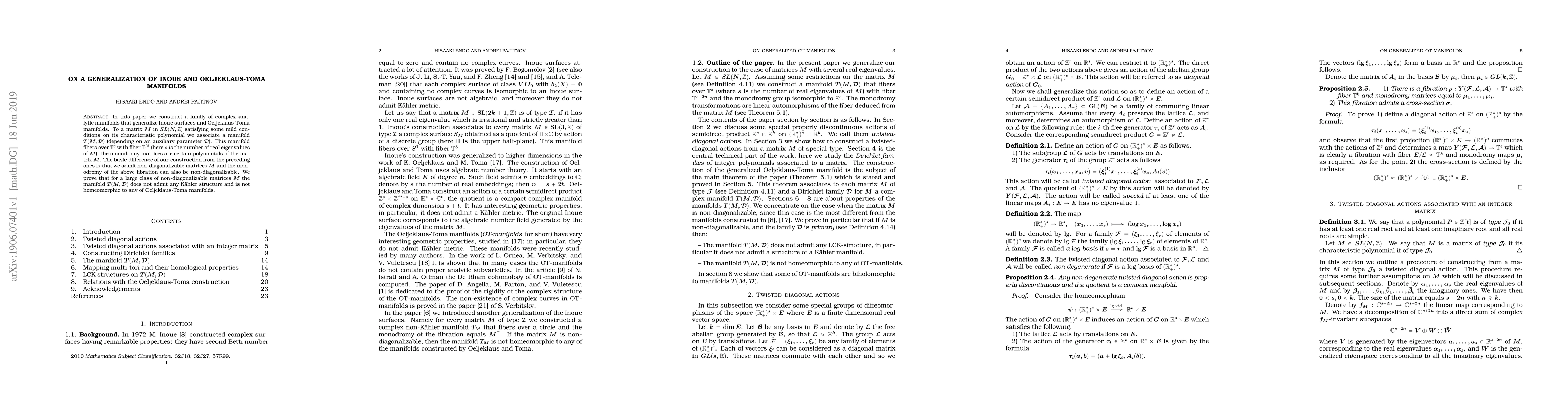 In this paper we construct a family of complex analytic manifolds that generalize Inoue surfaces and Oeljeklaus-Toma manifolds. To a matrix $M$ in $SL(N,\mathbb{Z})$ satisfying some mild conditions on its characteristic polynomial we associate a manifold $T(M,\mathbf{D})$ (depending on an auxiliary parameter $\mathbf{D}$). This manifold fibers over the $s$-dimensional torus $\mathbb{T}^s$, where $s$ is the number of real eigenvalues of $M$. The fiber is the $N$-dimensional torus $\mathbb{T}^{N}$, and the monodromy matrices are certain polynomials of the matrix $M$. The basic difference of our construction from the preceding ones is that we admit non-diagonalizable matrices $M$ and the monodromy of the above fibration can also be non-diagonalizable. We prove that for a large class of non-diagonalizable matrices $M$ the manifold $T(M,\mathbf{D})$ does not admit any K\"ahler structure and is not homeomorphic to any of Oeljeklaus-Toma manifolds.