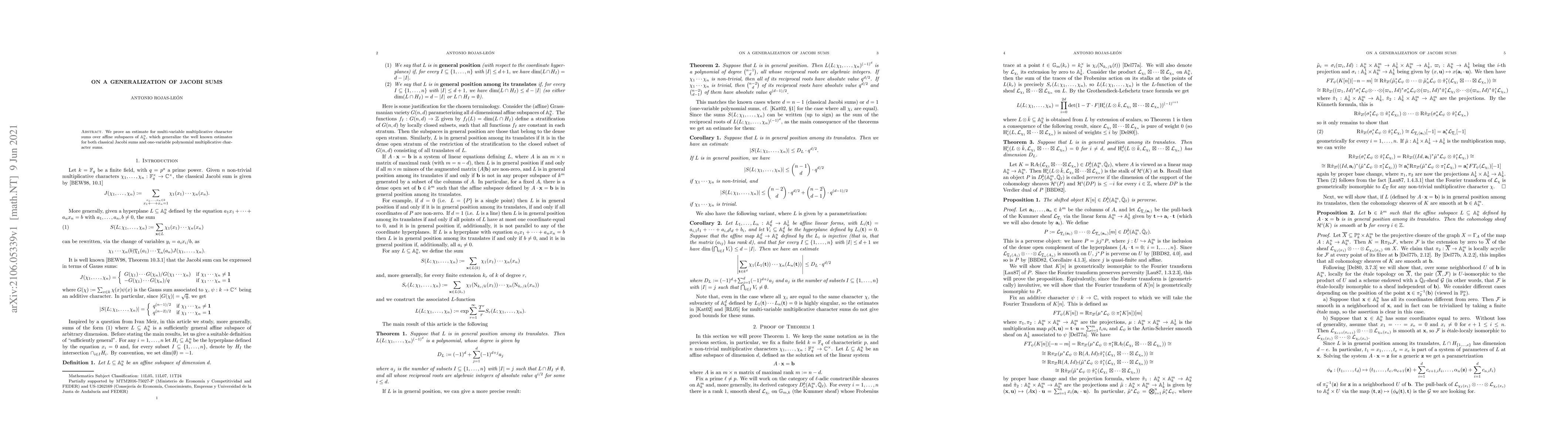 We prove an estimate for multi-variable multiplicative character sums over affine subspaces of $\mathbb A^n_k$, which generalize the well known estimates for both classical Jacobi sums and one-variable polynomial multiplicative character sums.