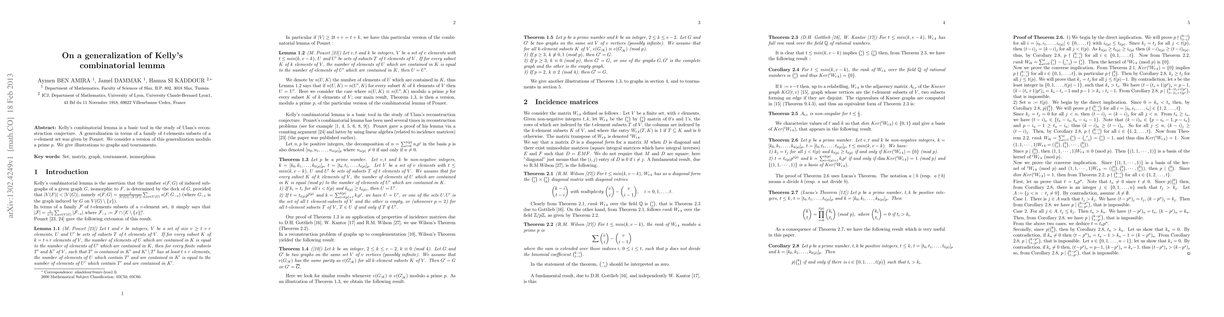 This paper generalizes Kelly's combinatorial lemma concerning Ulam's reconstruction conjecture for families of t-element subsets, focusing on a version modulo a prime p, and provides examples through graphs and tournaments.