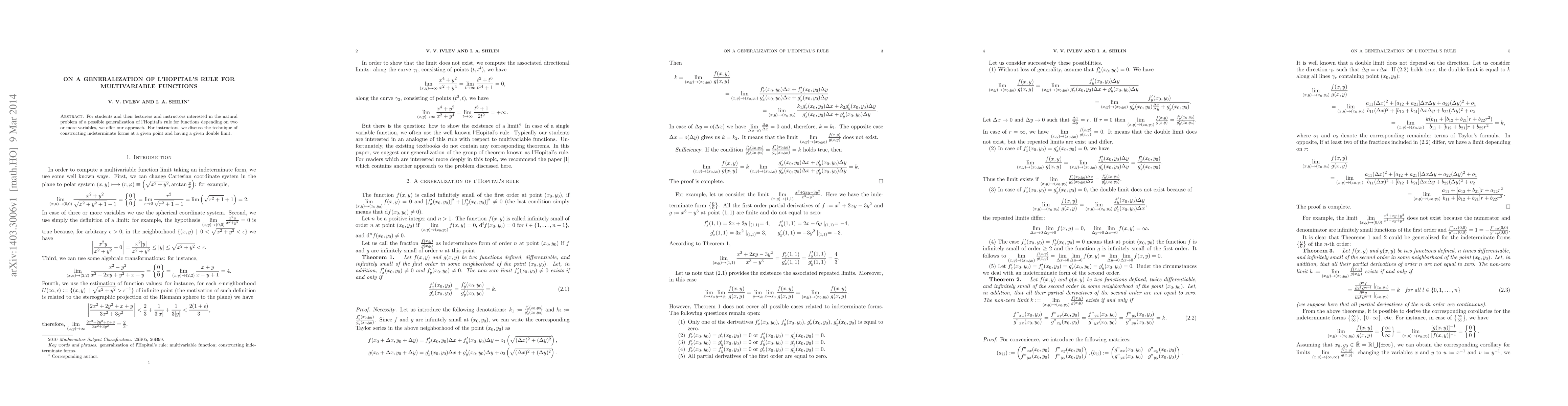 Researchers propose a generalization of l'Hopital's rule for multivariable functions, allowing for the evaluation of indeterminate forms in two or more variables. This new approach provides a technique for constructing indeterminate forms and evaluating double limits at specific points.