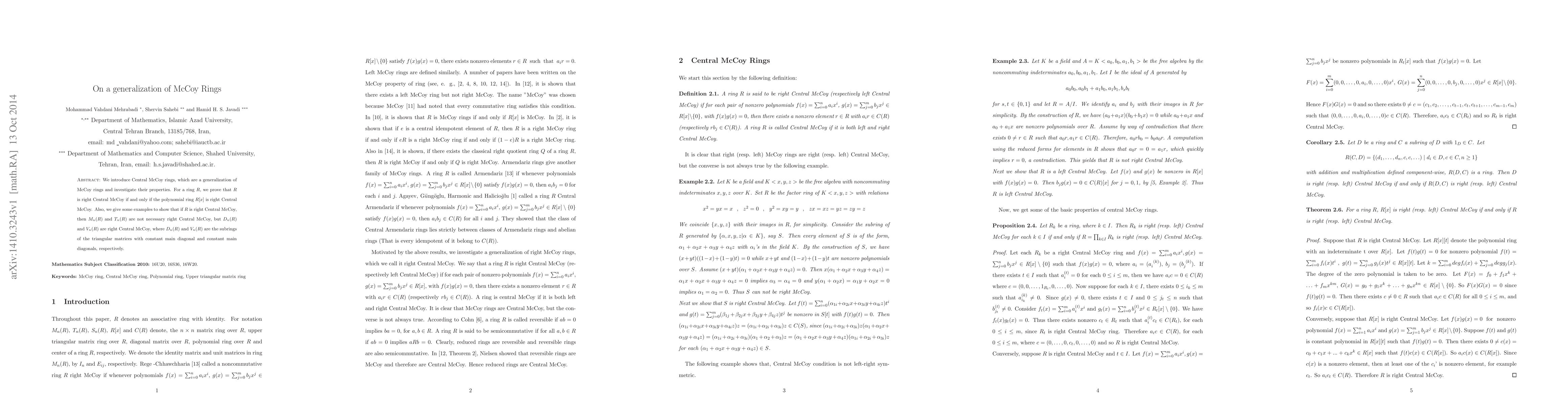 This paper introduces Central McCoy rings as a generalization of McCoy rings, showing that a ring is right Central McCoy if and only if its polynomial ring is. It also shows some specific examples where certain subrings have the right Central McCoy property.