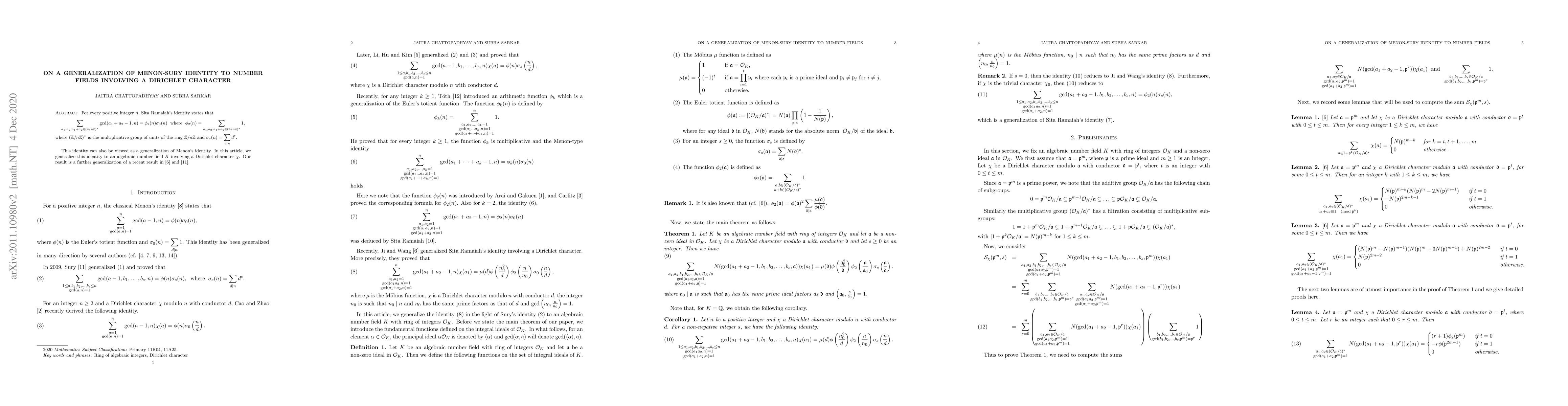 For every positive integer $n$, Sita Ramaiah's identity states that \medskip \begin{equation*} \sum_{a_1, a_2, a_1+a_2 \in (\mathbb{Z}/n\mathbb{Z})^*} \gcd(a_1+a_2-1,n) = \phi_2(n)\sigma_0(n) \; \text{ where } \; \phi_2(n)= \sum_{a_1, a_2, a_1+a_2 \in (\mathbb{Z}/n\mathbb{Z})^*} 1, \end{equation*} \medskip where $(\mathbb{Z}/n\mathbb{Z})^*$ is the multiplicative group of units of the ring $\mathbb{Z}/n\mathbb{Z}$ and $\sigma_s(n) = \displaystyle\sum_{d\mid n}d^s$. \smallskip This identity can also be viewed as a generalization of Menon's identity. In this article, we generalize this identity to an algebraic number field $K$ involving a Dirichlet character $\chi$. Our result is a further generalization of a recent result in \cite{wj} and \cite{sury}.