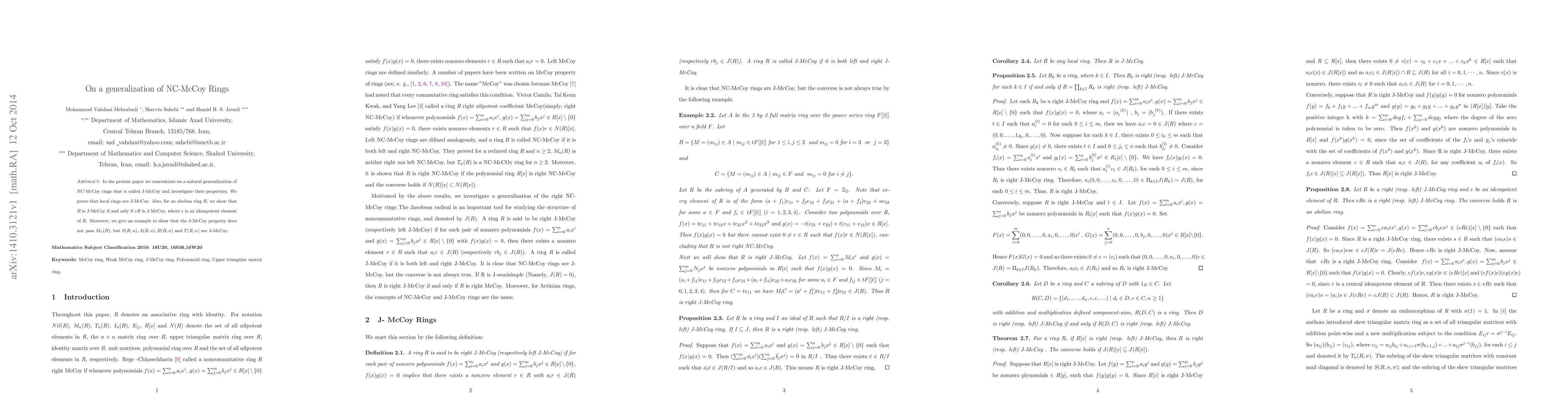 This paper generalizes NC-McCoy rings to J-McCoy rings and explores their properties, proving that local rings are J-McCoy. It also demonstrates that for an abelian ring R, R is J-McCoy if and only if eR is J-McCoy for an idempotent element e, while providing an example showing that the J-McCoy property does not extend to matrix rings but holds for certain related structures.