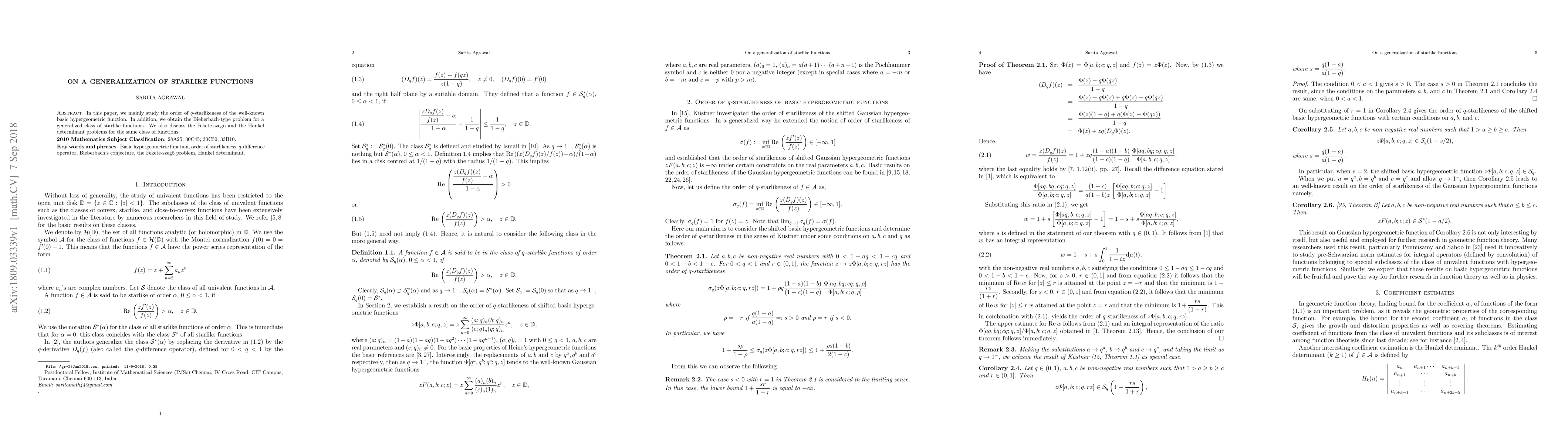 In this paper, we mainly study the order of $q$-starlikeness of the well-known basic hypergeometric function. In addition, we obtain the Bieberbach-type problem for a generalized class of starlike functions. We also discuss the Fekete-szeg\"o and the Hankel determinant problems for the same class of functions.
