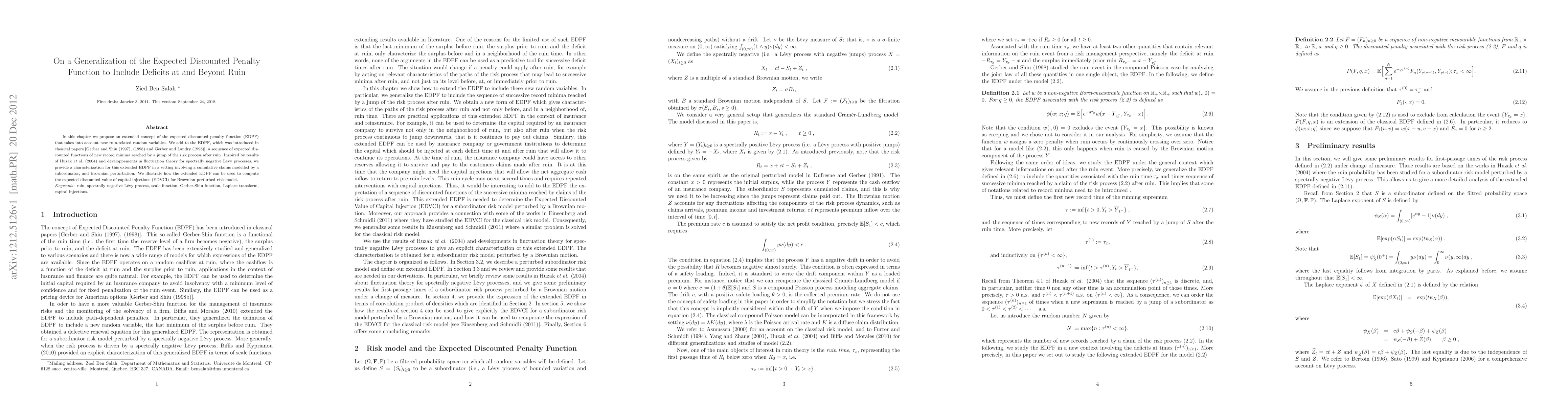 In this chapter we propose an extended concept of the expected discounted penalty function (EDPF) that takes into account new ruin-related random variables. We add to the EDPF, which was introduced in classical papers [Gerber and Shiu (1997), (1998) and Gerber and Landry (1998)], a sequence of expected discounted functions of new record minima reached by a jump of the risk process after ruin. Inspired by results of Huzak et al. (2004) and developpements in fluctuation theory for spectrally negative L\'evy processes, we provide a characterization for this extended EDPF in a setting involving a cumulative claims modelled by a subordinator, and Brownian perturbation. We illustrate how the extended EDPF can be used to compute the expected discounted value of capital injections (EDVCI) for Brownian perturbed risk model.