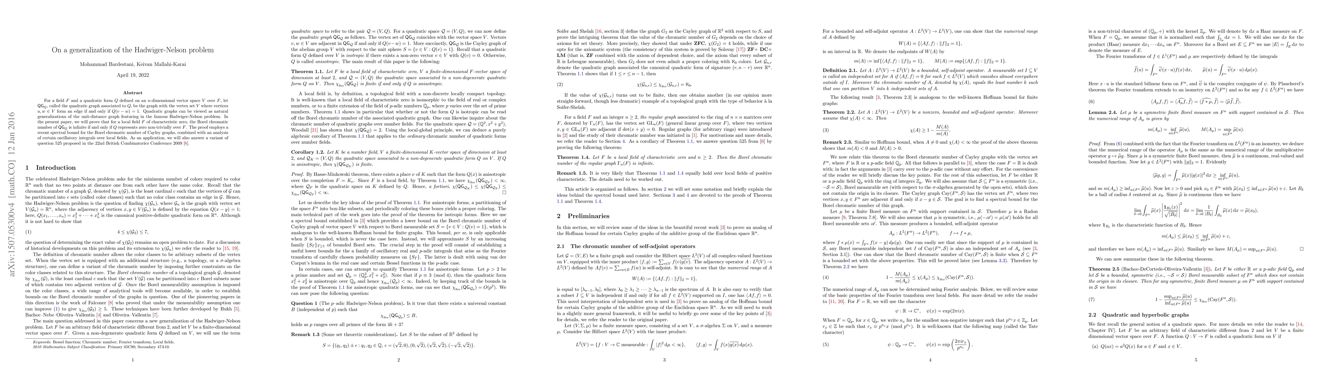 This paper generalizes the Hadwiger-Nelson problem by studying quadratic graphs associated with quadratic forms over local fields of characteristic zero. It proves that the Borel chromatic number of these graphs is infinite if and only if the quadratic form represents zero non-trivially, using spectral bounds and oscillatory integral analysis.