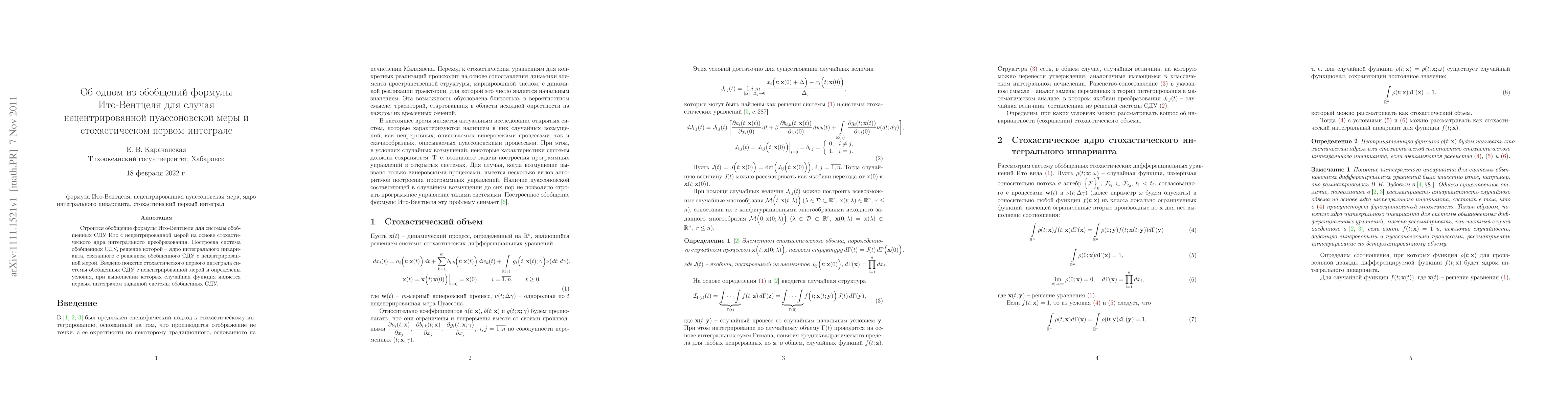 Generalization of the It\^{o}-Wentzel formula for the generalized It\^{o}'s SDEs (It\^{o}'s GSDEs) system with not centered measure is constructed. This construction is based on the basis of the stochastic kernel of integral transformation. The It\^{o}'s GSDEs system for the kernel of the integral invariant is constructed. The concept of a stochastic first integral of the It\^{o}'s GSDEs system with not centered measure is introduced. The conditions for the random function, that it's the first integral of the set It\^{o}'s GSDEs system, are defined.