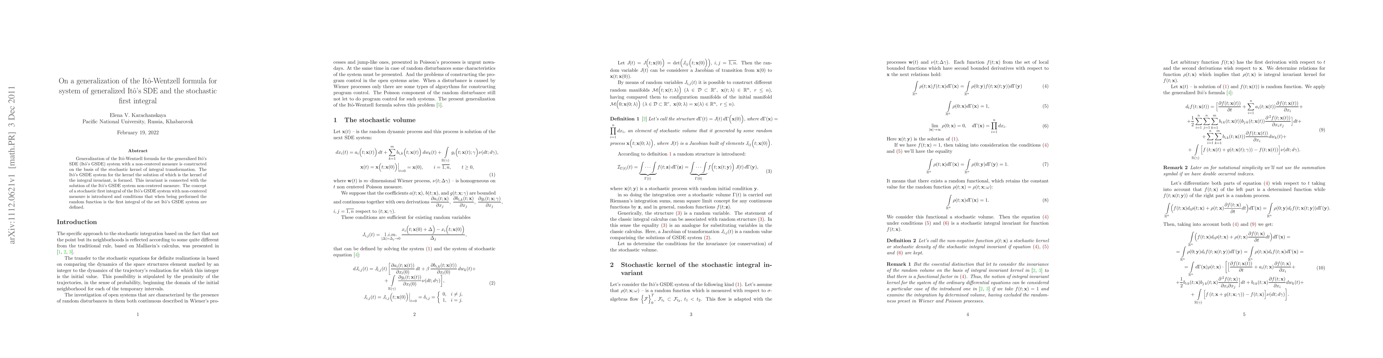 Generalization of the It\^{o}-Wentzell formula for the generalized It\^{o}'s SDE (It\^{o}'s GSDE) system with a non-centered measure is constructed on the basis of the stochastic kernel of integral transformation. The It\^{o}'s GSDE system for the kernel the solution of which is the kernel of the integral invariant, is formed. This invariant is connected with the solution of the It\^{o}'s GSDE system non-centered measure. The concept of a stochastic first integral of the It\^{o}'s GSDE system with non-centered measure is introduced and conditions that when being performed the random function is the first integral of the set It\^{o}'s GSDE system are defined.