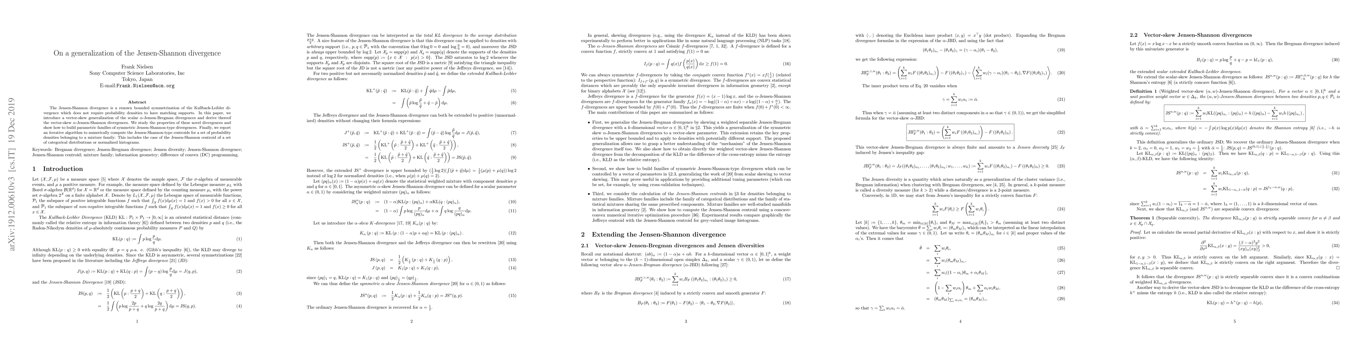 This paper generalizes the Jensen-Shannon divergence by introducing vector-skew $\alpha$-Jensen-Bregman divergences and deriving vector-skew $\alpha$-Jensen-Shannon divergences. It also presents an iterative algorithm for computing Jensen-Shannon-type centroids for probability densities in mixture families.