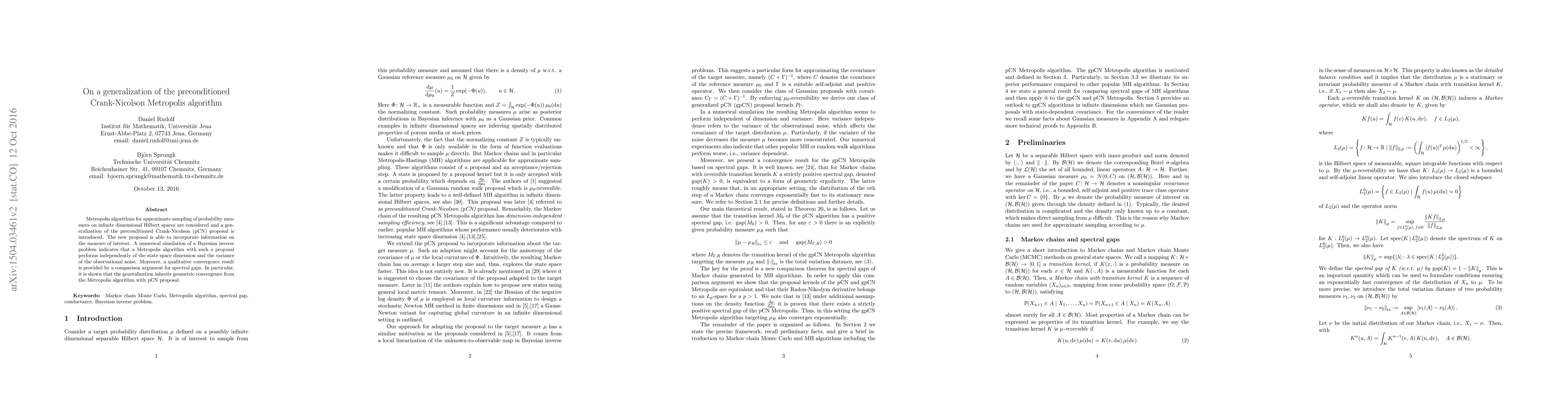 This paper introduces a generalized preconditioned Crank-Nicolson Metropolis algorithm for sampling in infinite dimensional Hilbert spaces, which incorporates measure-specific information. Numerical simulations show its effectiveness in Bayesian inverse problems, demonstrating independence from state space dimension and noise variance, and it inherits geometric ergodicity.
