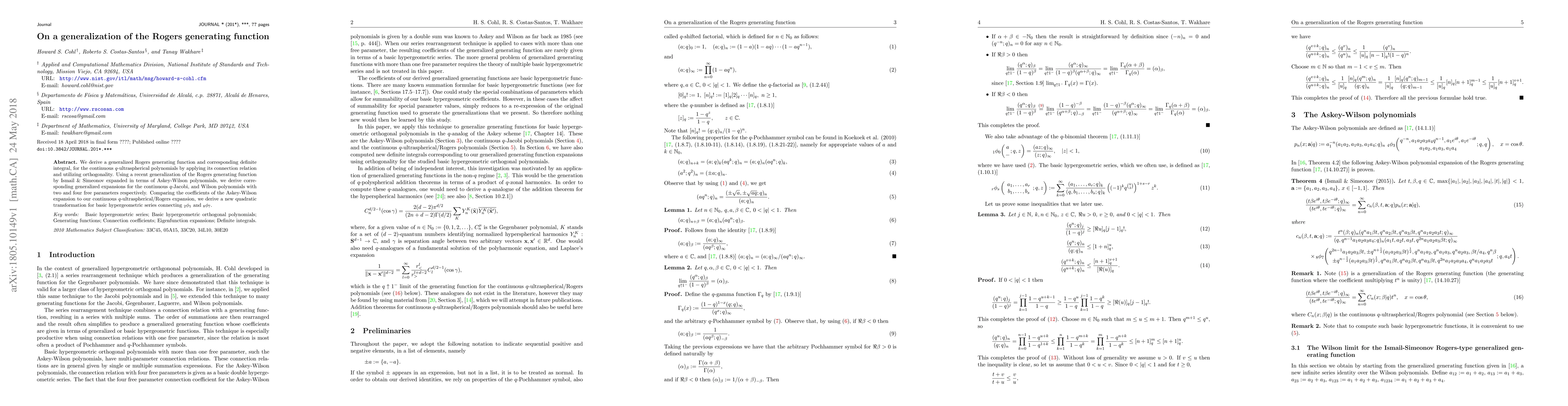 Summary: The paper derives a generalized Rogers generating function for continuous $q$-ultraspherical polynomials and establishes corresponding definite integrals using orthogonality. It extends this to continuous $q$-Jacobi and Wilson polynomials, leading to a new quadratic transformation for basic hypergeometric series connecting ${}_2\phi_1$ and ${}_8\phi_7$.