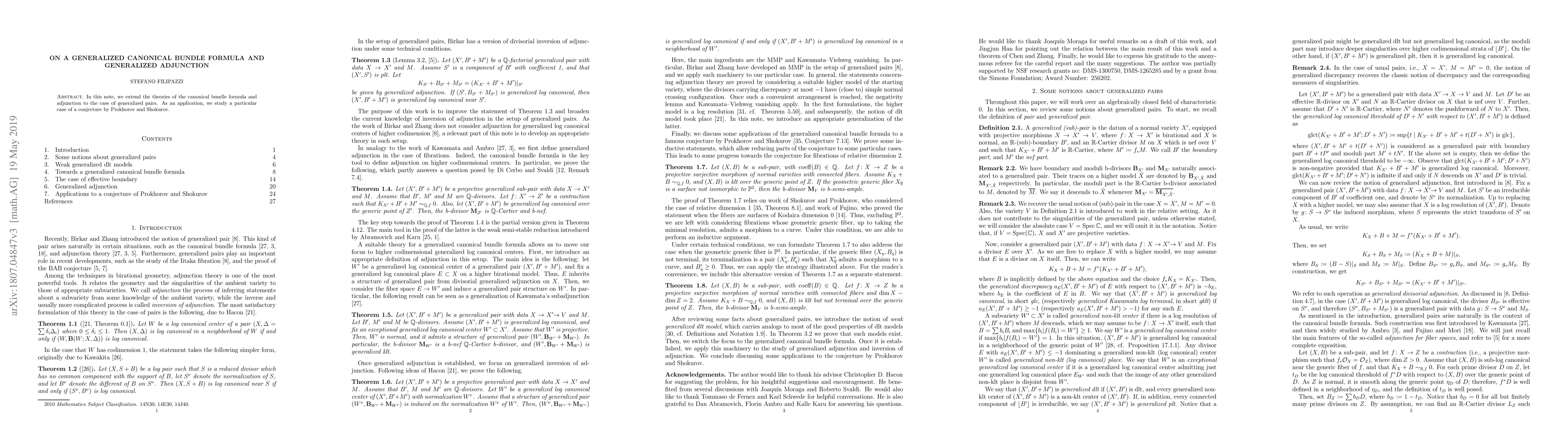 This paper extends the canonical bundle formula and adjunction theories to generalized pairs, applying these extensions to investigate a specific conjecture by Prokhorov and Shokurov. The work provides new insights into the algebraic geometry of generalized pairs.
