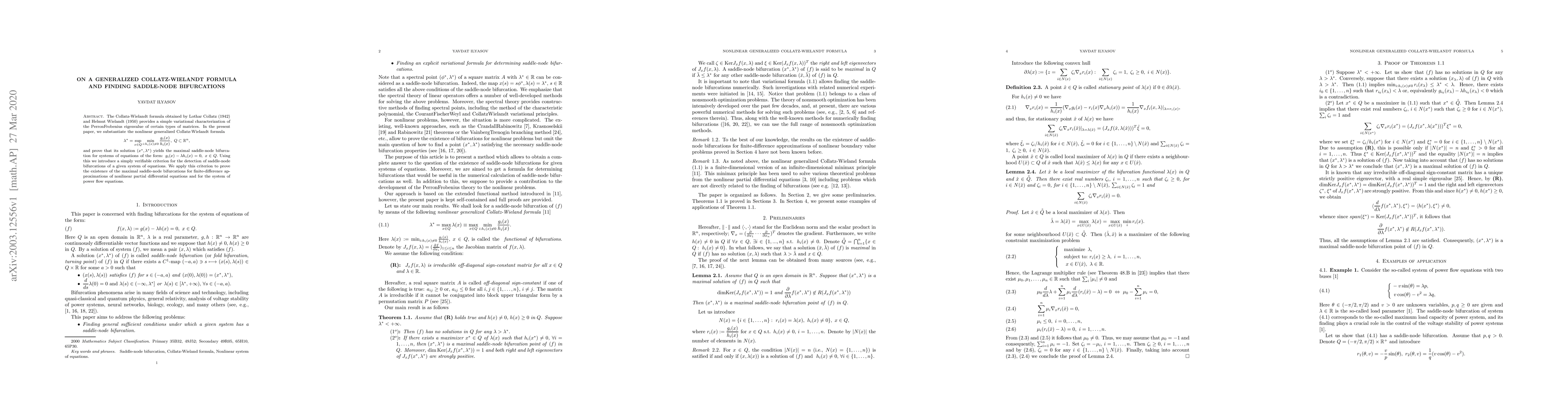 We introduce the nonlinear generalized Collatz-Wielandt formula $$ \lambda^*= \sup_{x\in Q}\min_{i:h_i(x) \neq 0} \frac{g_i(x)}{ h_i(x)}, ~~Q \subset \mathbb{R}^n,$$ and prove that its solution $(x^*,\lambda^*)$ yields the maximal saddle-node bifurcation for systems of equations of the form: $g(x)-\lambda h(x)=0, ~~x \in Q$. Using this we introduce a simply verifiable criterion for the detection of saddle-node bifurcations of a given system of equations. We apply this criterion to prove the existence of the maximal saddle-node bifurcations for finite-difference approximations of nonlinear partial differential equations and for the system of power flow equations.