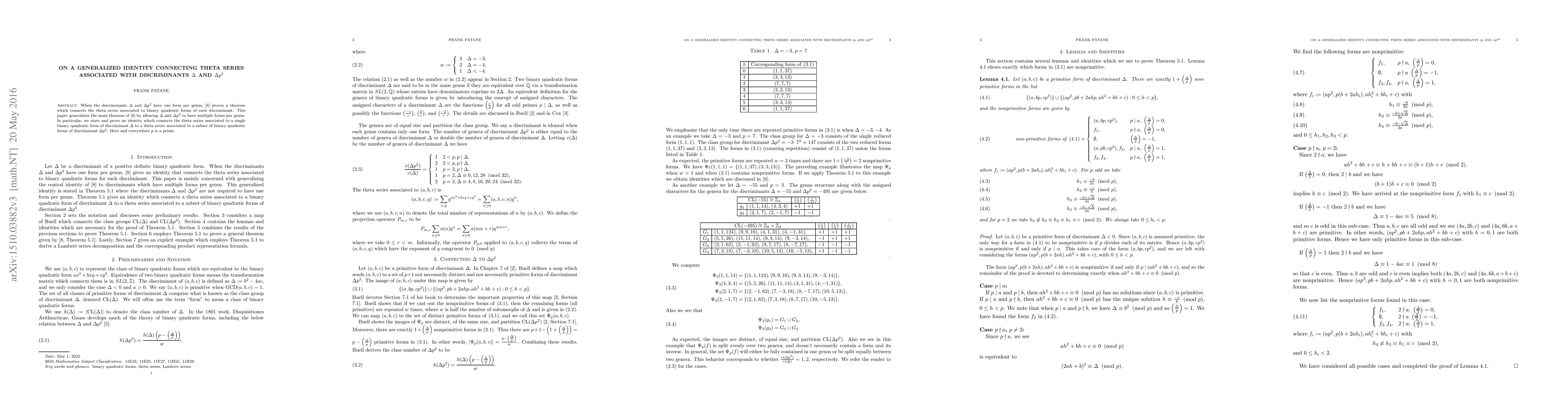 This paper generalizes Patane's theorem connecting theta series for binary quadratic forms with discriminants $\Delta$ and $\Delta p^2$, removing the requirement that these discriminants be idoneal. It establishes an identity linking the theta series of a single form with discriminant $\Delta$ to those of a subset of forms with discriminant $\Delta p^2$.