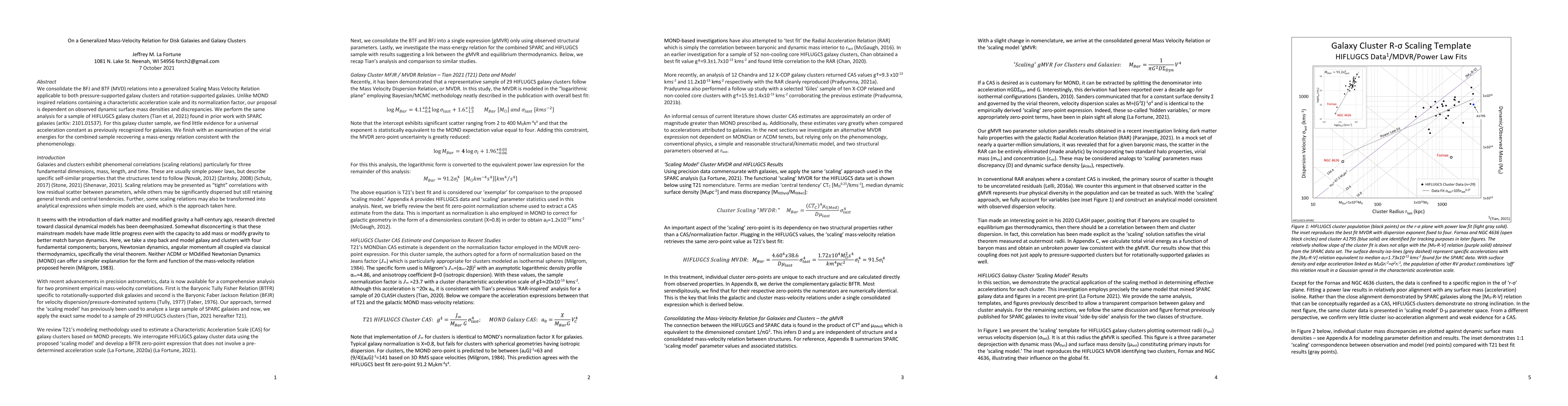 We consolidate the BFJ and BTF (MVD) relations into a generalized Scaling Mass Velocity Relation applicable to both pressure-supported galaxy clusters and rotation-supported galaxies. Unlike MOND inspired relations containing a characteristic acceleration scale and its normalization factor, our proposal is dependent on observed dynamic surface mass densities and discrepancies. We perform the same analysis for a sample of HIFLUGCS galaxy clusters (Tian et al, 2021) found in prior work with SPARC galaxies (arXiv: 2101.01537). For this galaxy cluster sample, we find little evidence for a universal acceleration constant as previously recognized for galaxies. We finish with an examination of the virial energies for the combined sample recovering a mass-energy relation consistent with the phenomenology.