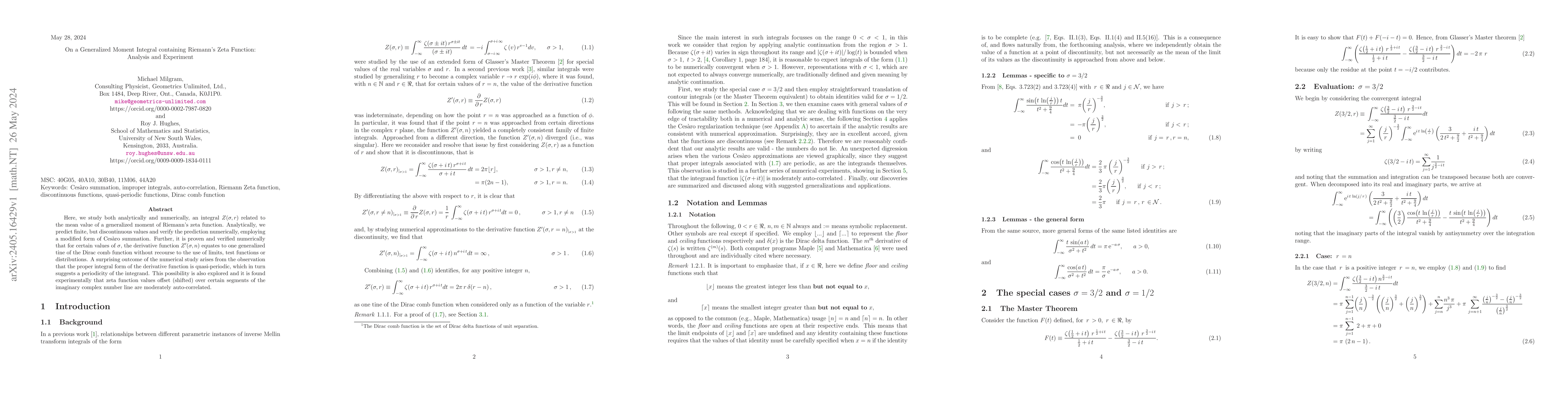 This research paper analyzes and experiments on an integral $Z(\sigma,r)$ associated with the mean value of a generalized moment of Riemann's zeta function, predicting and numerically verifying its finite but discontinuous values. It further reveals that for specific $\sigma$ values, the derivative $Z^{\prime}(\sigma,n)$ corresponds to a generalized Dirac comb function, and surprisingly, the derivative's integral form exhibits quasi-periodicity suggesting periodicity in the integrand, with numerical evidence of moderate autocorrelation in shifted zeta function values.