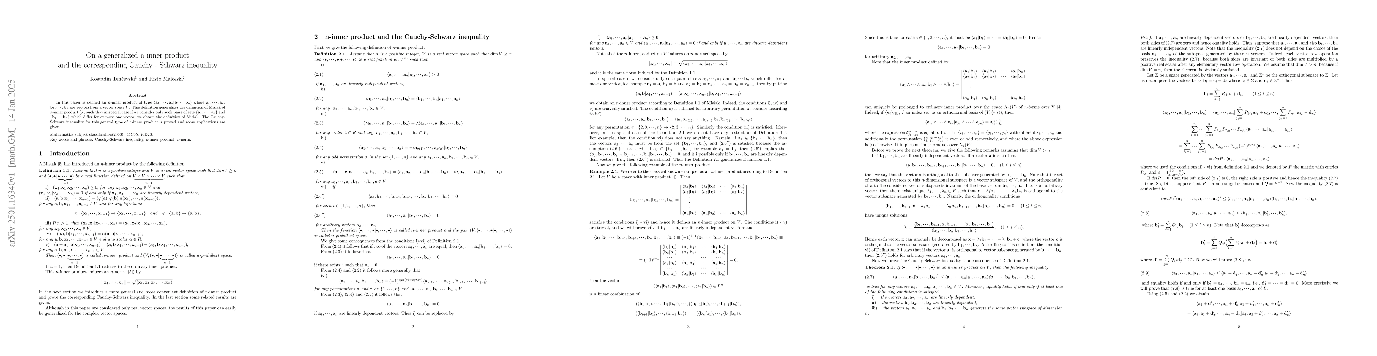 In this paper is defined an $n$-inner product of type $\langle {\bf a}_1,\cdots ,{\bf a}_n\vert {\bf b}_1\cdots {\bf b}_n\rangle $ where ${\bf a}_1,\cdots ,{\bf a}_n$, ${\bf b}_1, \cdots ,{\bf b}_n$ are vectors from a vector space $V$. This definition generalizes the definition of Misiak of $n$-inner product \cite{2}, such that in special case if we consider only such pairs of sets $\{ {\bf a}_1,\cdots ,{\bf a}_1\}$ and $\{ {\bf b}_1\cdots {\bf b}_n\}$ which differ for at most one vector, we obtain the definition of Misiak. The Cauchy-Schwarz inequality for this general type of $n$-inner product is proved and some applications are given.