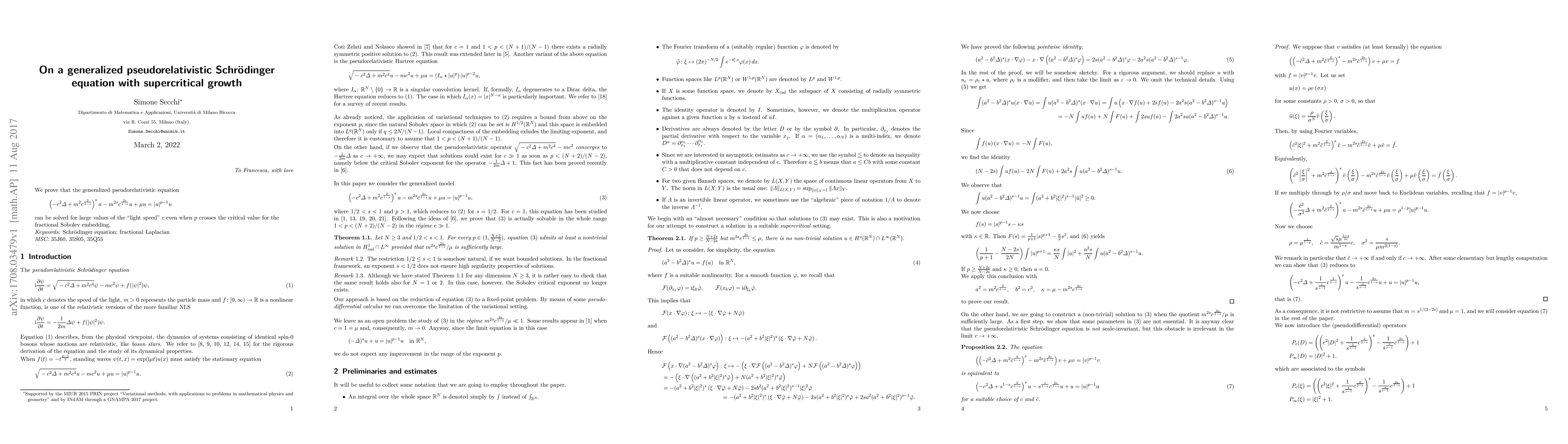 We prove that the generalized pseudorelativistic equation $$ \left( -c^2 \Delta + m^{2} c^{\frac{2}{1-s}} \right)^{s} u - m^{2s} c^{\frac{2s}{1-s}} u +\mu u = |u|^{p-1} u $$ can be solved for large values of the "light speed" $c$ even when $p$ crosses the critical value for the fractional Sobolev embedding.