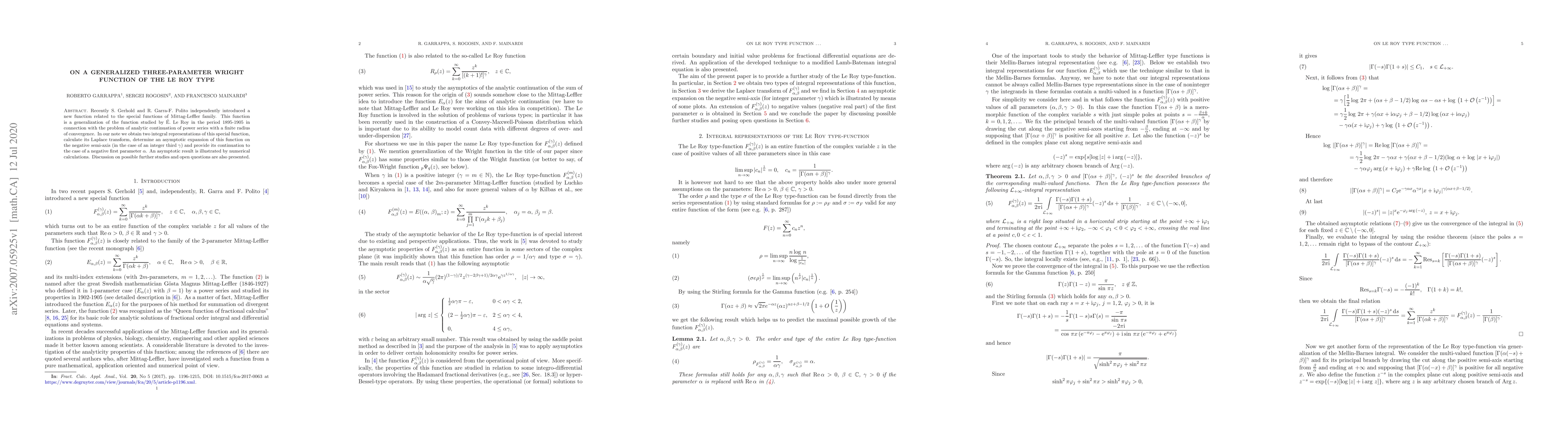 Recently S. Gerhold and R. Garra-F. Polito independently introduced a new function related to the special functions of Mittag-Leffler family. This function is a generalization of the function studied by E. Le Roy in the period 1895-1905 in connection with the problem of analytic continuation of power series with a finite radius of convergence. In our note we obtain two integral representations of this special function, calculate its Laplace transform, determine an asymptotic expansion of this function on the negative semi-axis (in the case of an integer third parameter $\gamma$) and provide its continuation to the case of a negative first parameter $\alpha$. An asymptotic result is illustrated by numerical calculations. Discussion on possible further studies and open questions are also presented.