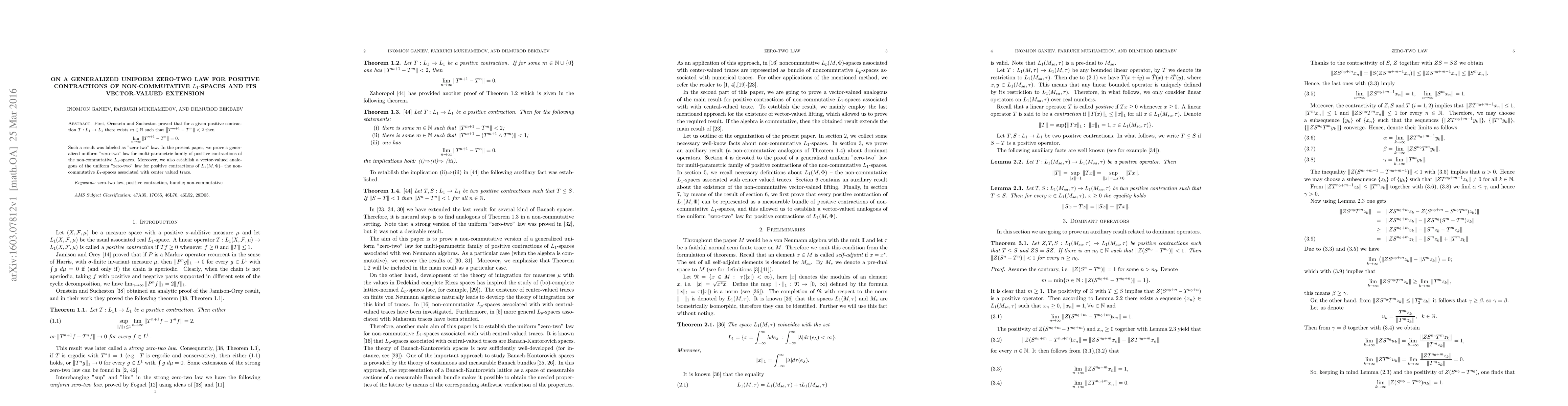 This paper generalizes the "zero-two law" for positive contractions in non-commutative $L_1$-spaces, proving a uniform version for multi-parametric families. It also extends this result to vector-valued positive contractions in $L_1(M,\Phi)$-spaces.