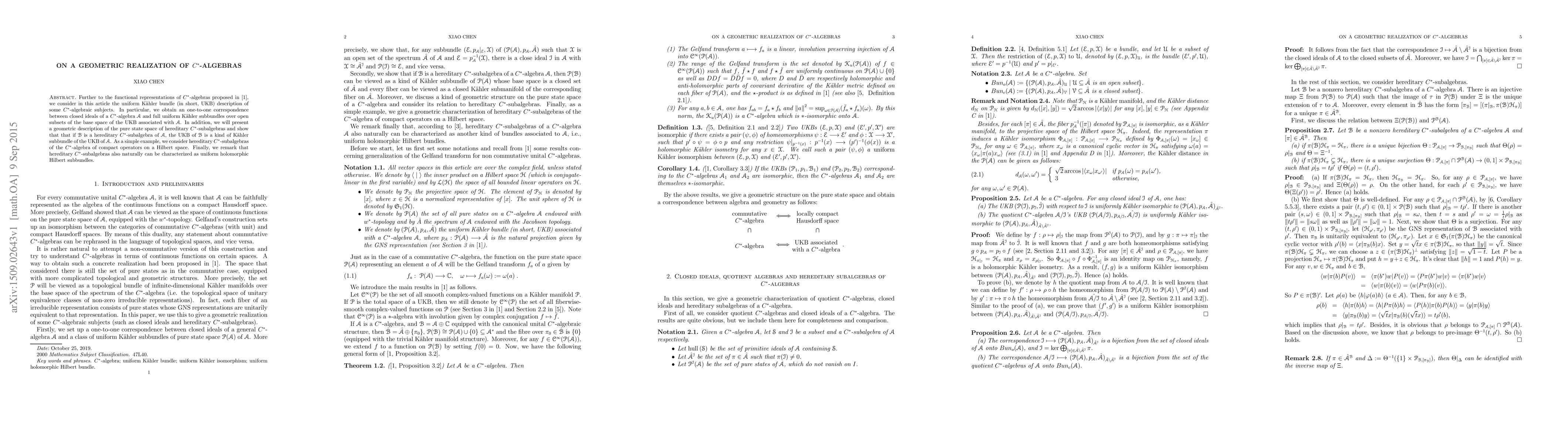 Further to the functional representations of C$^*$-algebras proposed by R. Cirelli, A. Mania and L. Pizzocchero, we consider in this article the uniform K\"ahler bundle (in short, UKB) description of some C$^*$-algebraic subjects. In particular, we obtain an one-to-one correspondence between closed ideals of a C$^*$-algebra $\mathcal{A}$ and full uniform K\"ahler sub bundles over open subsets of the base space of the UKB associated with $\mathcal{A}$. In addition, we will present a geometric description of the pure state space of hereditary C$^*$-subalgebras and show that that if $\mathcal{B}$ is a hereditary C$^*$-subalgebra of $\mathcal{A}$, the UKB of $\mathcal{B}$ is a kind of K\"ahler subbundle of the UKB of $\mathcal{A}$. As a simple example, we consider hereditary C$^*$-subalgebras of the C$^*$-algebra of compact operators on a Hilbert space. Finally, we remark that hereditary C$^*$-subalgebras also naturally can be characterized as uniform holomorphic Hilbert subbundles.