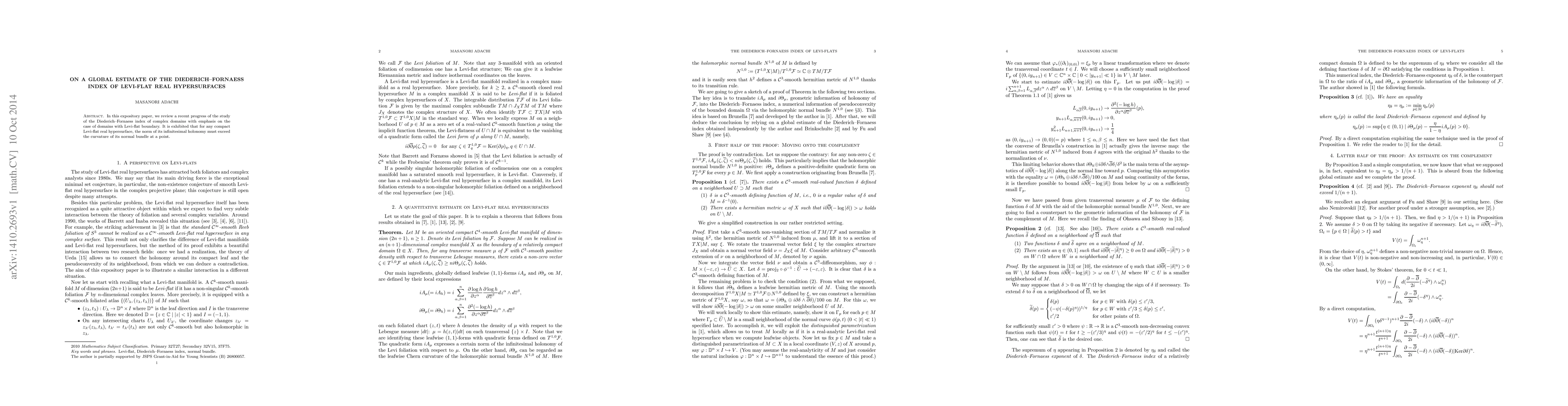 This paper reviews advancements in the study of the Diederich-Fornaess index for complex domains, focusing on Levi-flat boundaries. It establishes that for any compact Levi-flat real hypersurface, the norm of its infinitesimal holonomy exceeds the curvature of its normal bundle at a point.