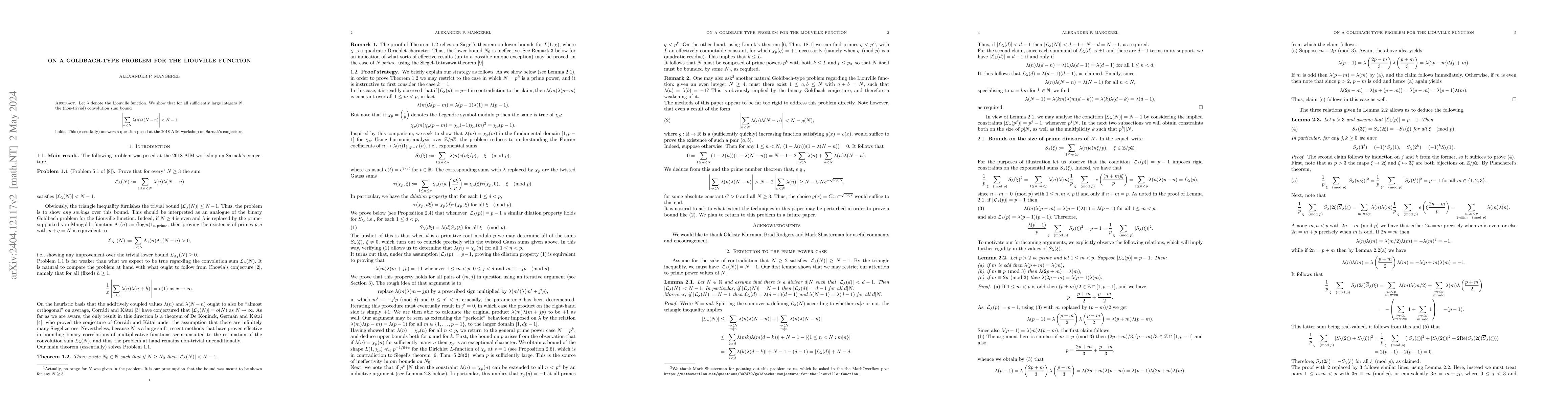 The paper proves that for sufficiently large integers $N$, the convolution sum involving the Liouville function satisfies $\left|\sum_{1 \leq n < N} \lambda(n) \lambda(N-n)\right| < N-1$, addressing a question related to Sarnak's conjecture posed at a 2018 AIM workshop.