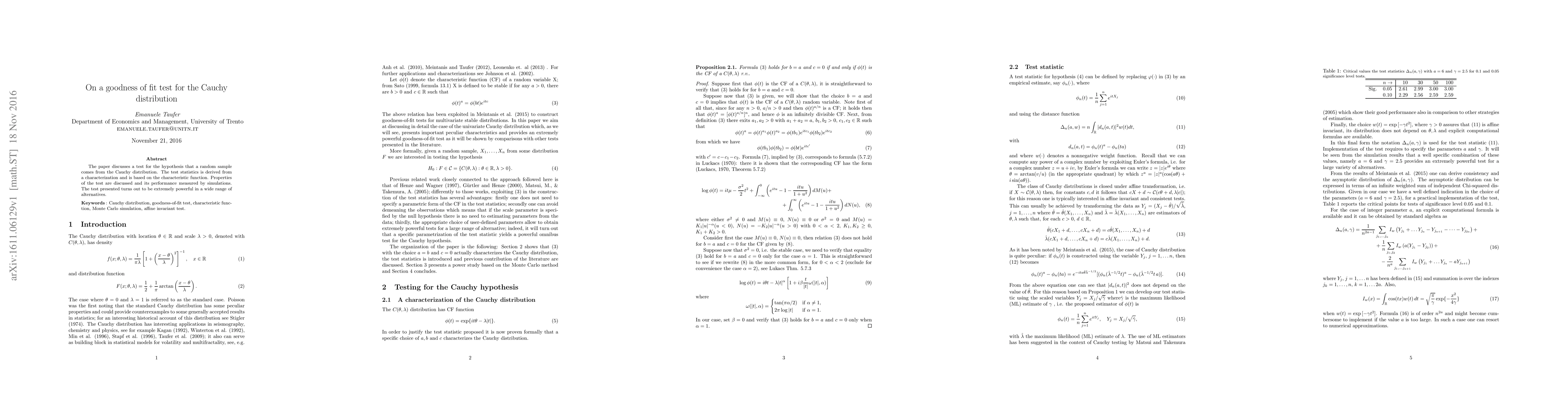 This paper proposes a goodness of fit test for the Cauchy distribution based on the characteristic function, demonstrating its effectiveness through simulations which show it to be highly powerful against various alternatives.