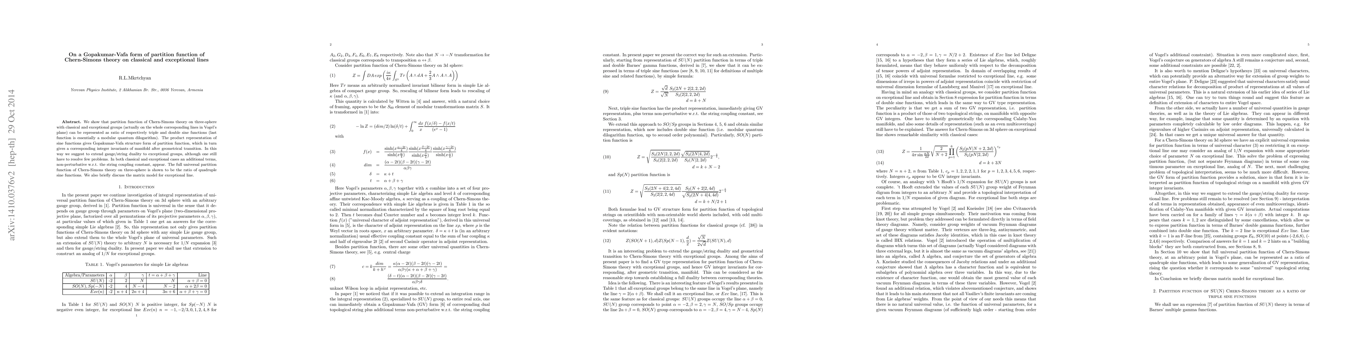 We show that partition function of Chern-Simons theory on three-sphere with classical and exceptional groups (actually on the whole corresponding lines in Vogel's plane) can be represented as ratio of respectively triple and double sine functions (last function is essentially a modular quantum dilogarithm). The product representation of sine functions gives Gopakumar-Vafa structure form of partition function, which in turn gives a corresponding integer invariants of manifold after geometrical transition. In this way we suggest to extend gauge/string duality to exceptional groups, although one still have to resolve few problems. In both classical and exceptional cases an additional terms, non-perturbative w.r.t. the string coupling constant, appear. The full universal partition function of Chern-Simons theory on three-sphere is shown to be the ratio of quadruple sine functions. We also briefly discuss the matrix model for exceptional line.