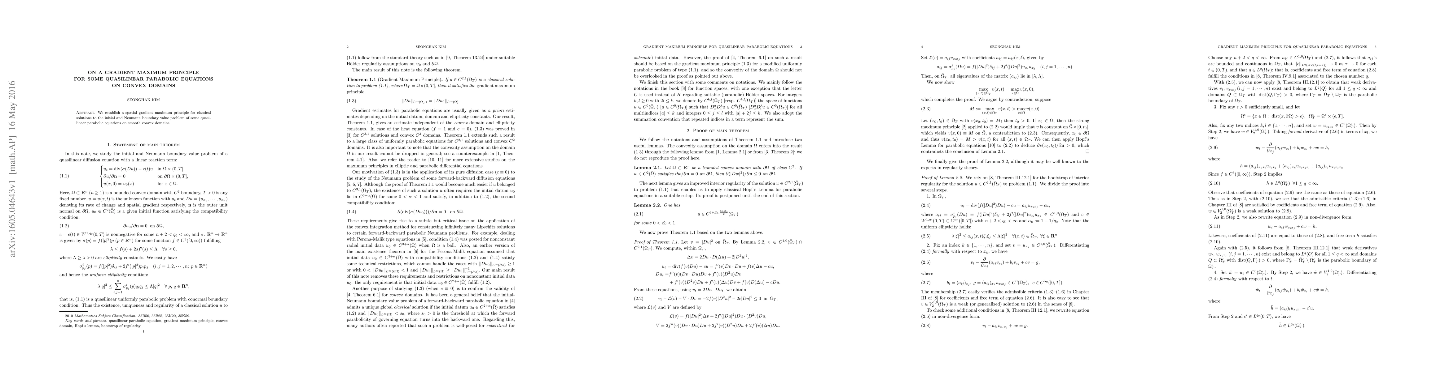 Summary: This paper establishes a spatial gradient maximum principle for classical solutions to quasilinear parabolic equations on smooth convex domains, addressing the initial and Neumann boundary value problem. The principle provides insights into the behavior of the solutions' gradients.