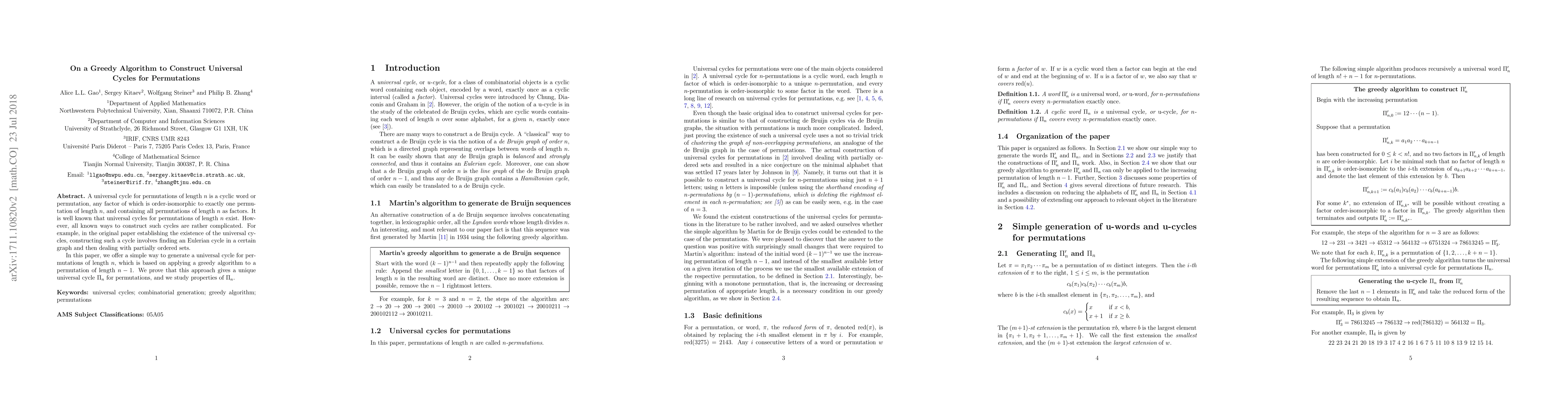 The paper presents a greedy algorithm to construct a universal cycle for permutations of length n, starting with a permutation of length n-1.