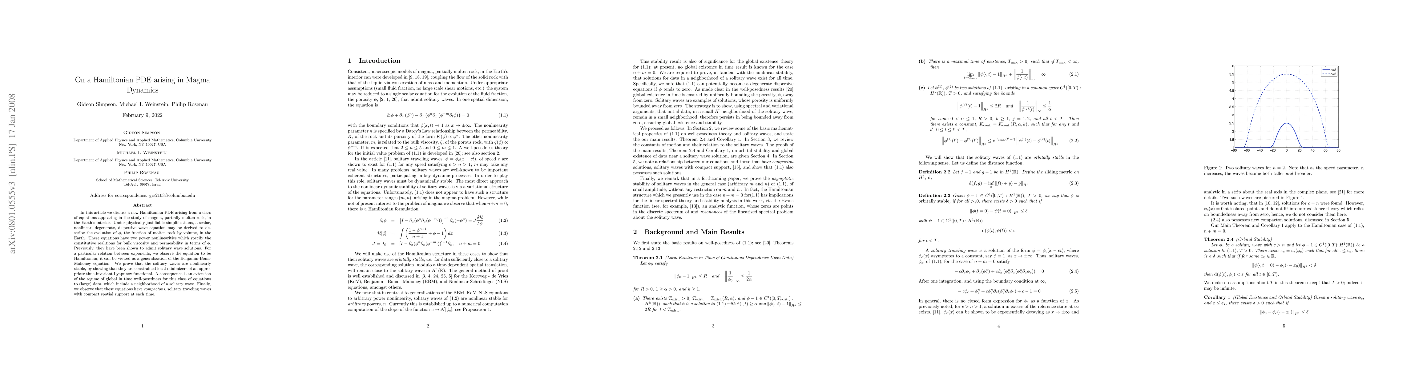In this article we discuss a new Hamiltonian PDE arising from a class of equations appearing in the study of magma, partially molten rock, in the Earth's interior. Under physically justifiable simplifications, a scalar, nonlinear, degenerate, dispersive wave equation may be derived to describe the evolution of $\phi$, the fraction of molten rock by volume, in the Earth. These equations have two power nonlinearities which specify the constitutive realitions for bulk viscosity and permeability in terms of $\phi$. Previously, they have been shown to admit solitary wave solutions. For a particular relation between exponents, we observe the equation to be Hamiltonian; it can be viewed as a generalization of the Benjamin-Bona-Mahoney equation. We prove that the solitary waves are nonlinearly stable, by showing that they are constrained local minimizers of an appropriate time-invariant Lyapunov functional. A consequence is an extension of the regime of global in time well-posedness for this class of equations to (large) data, which include a neighborhood of a solitary wave. Finally, we observe that these equations have {\it compactons}, solitary traveling waves with compact spatial support at each time.
